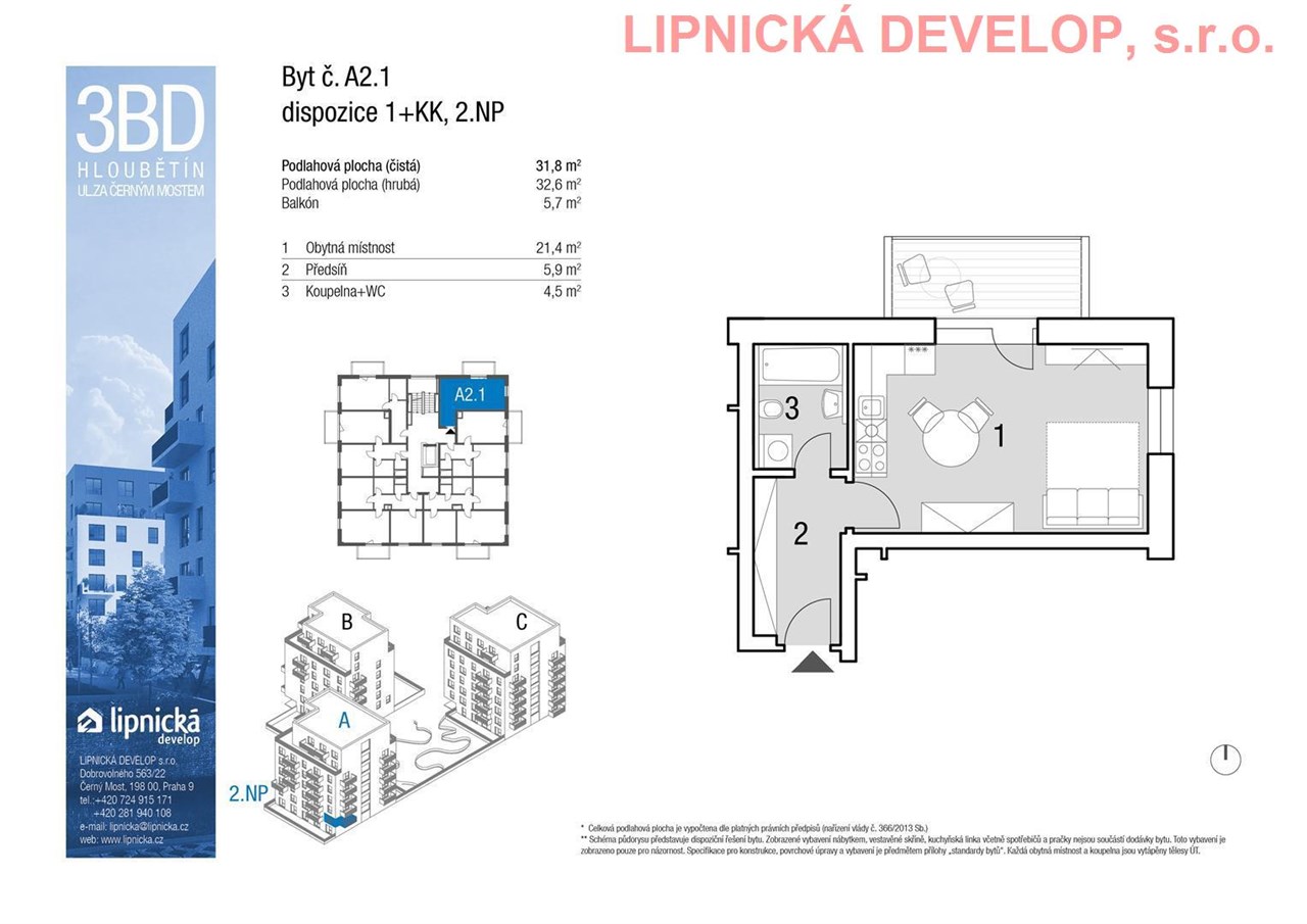 Prodej nového bytu s označením A2.1 o dispozici 1+kk v developerském projektu "NOVOSTAVBA 3 BYTOVÝCH DOMŮ", Hloubětín. Podlahová plocha bytu je 32,6 m2 (užitná plocha bytu je 31,8 m2) + 1x sklepní kóje o výměře 2,1 m2 + balkón o výměře 5,7 m2. Byt se nachází ve 2. nadzemním podlaží domu. Byt se skládá z obývacího pokoje s kuchyňským koutem, koupelny + WC a předsíně. Foto viz. dole.