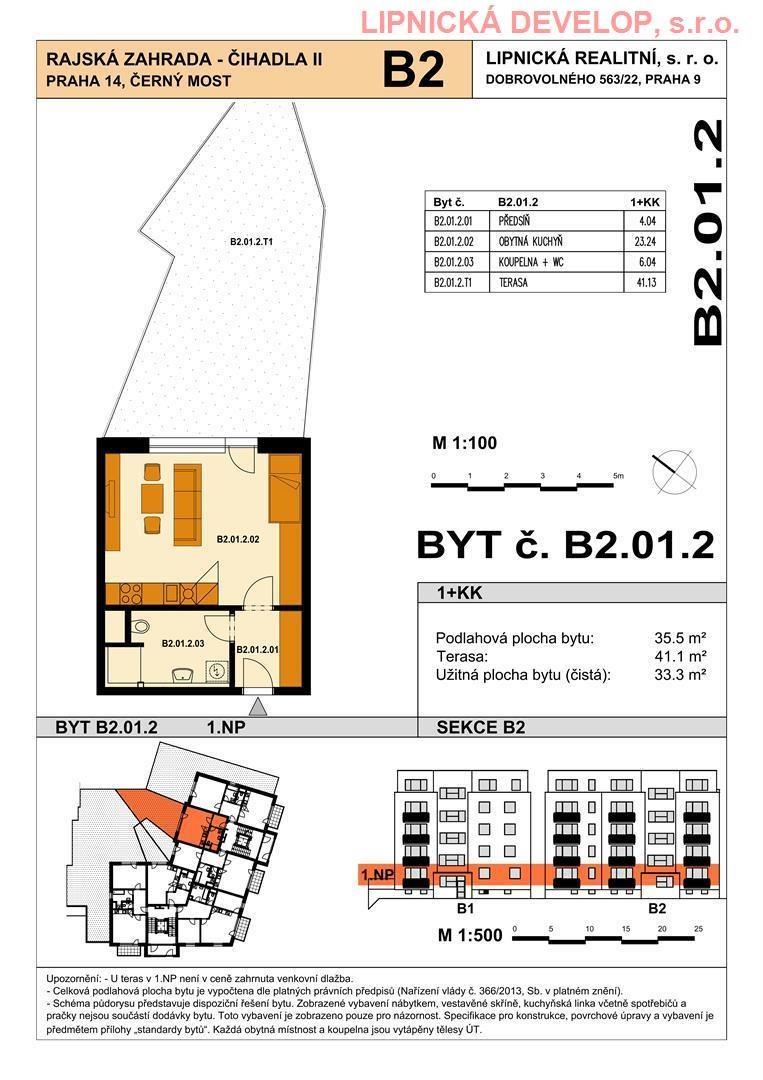 Prodej nového bytu s označení B2.01.2 o dispozici 1+kk v developerském projektu AREÁL RAJSKÁ ZAHRADA - ČIHADLA II, BYTOVÉ DOMY "B", "D", PRAHA 9. Byt se nachází v bytovém domě B. Podlahová plocha bytu je 35,5 m2 (užitná plocha bytu je 33,3 m2) + sklepní kóje o výměře 1,6 m2 + zatravněná terasa o výměře 41,1 m2. Byt se nachází v 1. nadzemním podlaží domu. Byt se skládá z obývacího pokoje, chodby, koupelny + WC. Velikou výhodou je zatravněná terasa (předzahrádka) přístupná z obývacího pokoje.