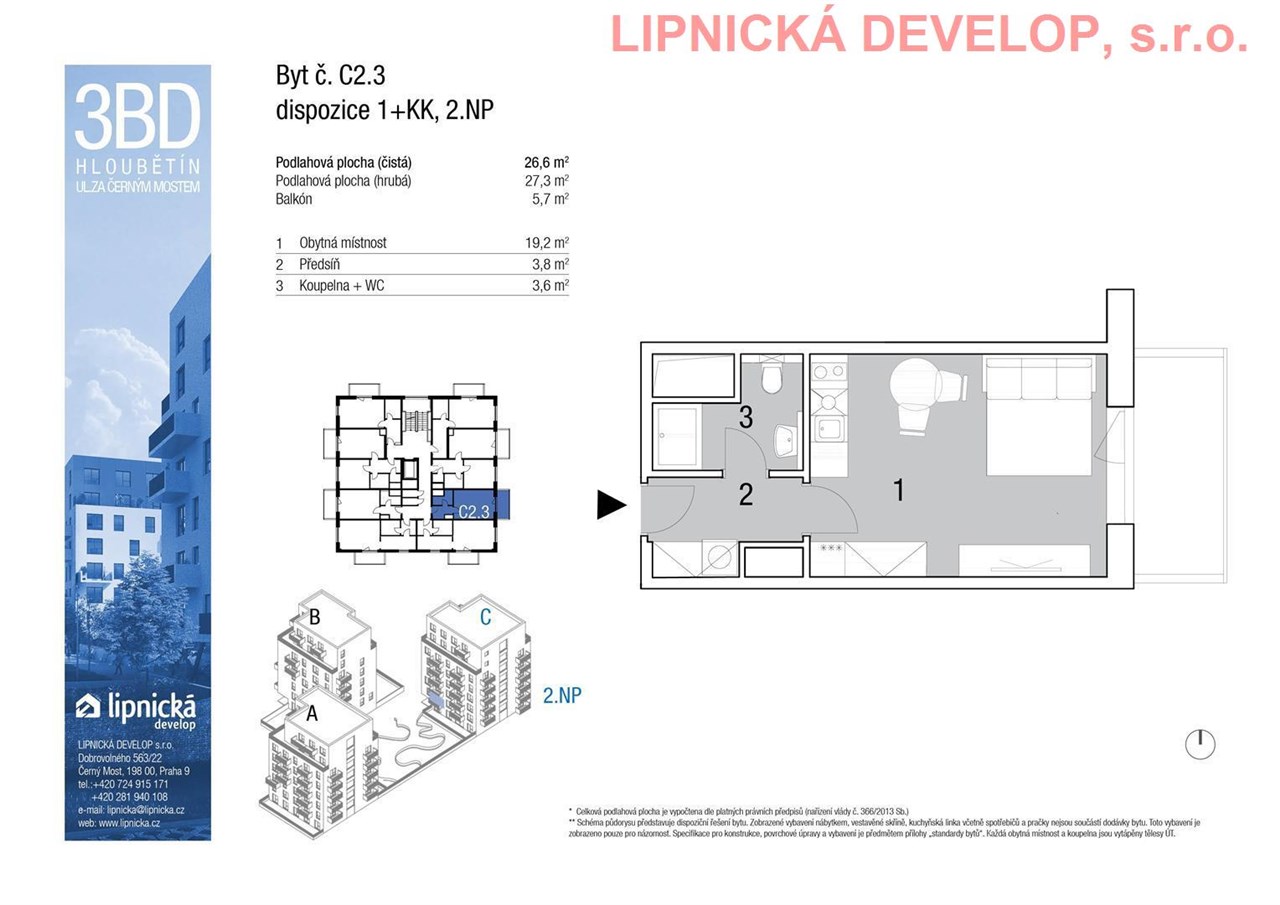 Prodej nového bytu s označením C2.3 o dispozici 1+kk v developerském projektu "NOVOSTAVBA 3 BYTOVÝCH DOMŮ", Hloubětín. Podlahová plocha bytu je 27,3 m2 (užitná plocha bytu je 26,6 m2) + komora o výměře 1,8 m2 + balkón o výměře 5,7 m2. Byt se nachází ve 2. nadzemním podlaží domu. Byt se skládá z obývacího pokoje s kuchyňským koutem, koupelny + WC a předsíně. Z obývacího pokoje je vstup na balkón.