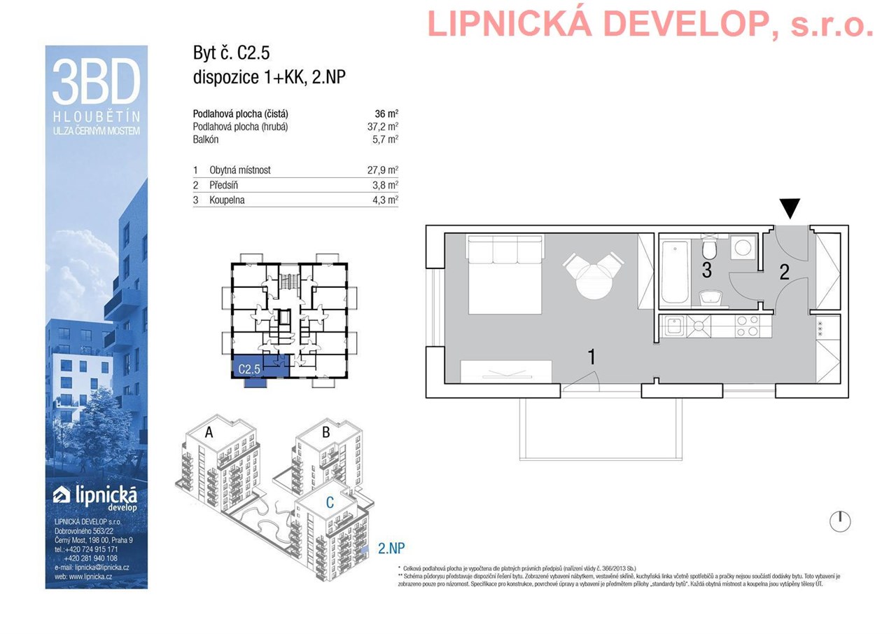 Prodej nového bytu s označením C2.5 o dispozici 1+kk v developerském projektu "NOVOSTAVBA 3 BYTOVÝCH DOMŮ", Hloubětín. Podlahová plocha bytu je 37,2 m2 (užitná plocha bytu je 36,0 m2) + sklepní kóje o výměře 2,1 m2 + balkón o výměře 5,7 m2. Byt se nachází ve 2. nadzemním podlaží domu. Byt se skládá z obývacího pokoje s kuchyňským koutem, koupelny + WC a předsíně. Z obývacího pokoje je vstup na balkón.