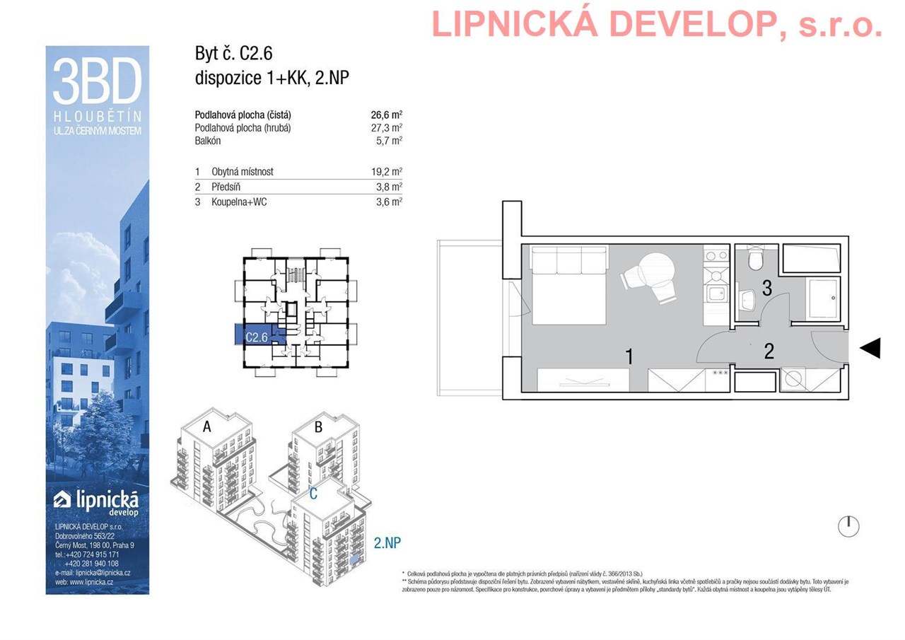 Prodej nového bytu s označením C2.6 o dispozici 1+kk v developerském projektu "NOVOSTAVBA 3 BYTOVÝCH DOMŮ", Hloubětín. Podlahová plocha bytu je 27,3 m2 (užitná plocha bytu je 26,6 m2) + komora o výměře 1,8 m2 + balkón o výměře 5,7 m2. Byt se nachází ve 2. nadzemním podlaží domu. Byt se skládá z obývacího pokoje s kuchyňským koutem, koupelny + WC a předsíně. Z obývacího pokoje je vstup na balkón.