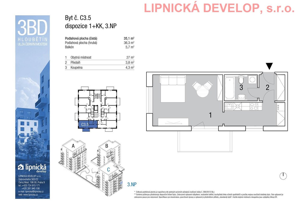 Prodej nového bytu s označením C3.5 o dispozici 1+kk v developerském projektu "NOVOSTAVBA 3 BYTOVÝCH DOMŮ", Hloubětín. Podlahová plocha bytu je 36,3 m2 (užitná plocha bytu je 35,1 m2) + sklepní kóje o výměře 2,1 m2 + balkón o výměře 5,7 m2. Byt se nachází ve 3. nadzemním podlaží domu. Byt se skládá z obývacího pokoje s kuchyňským koutem, koupelny + WC a předsíně. Z obývacího pokoje je vstup na balkón.