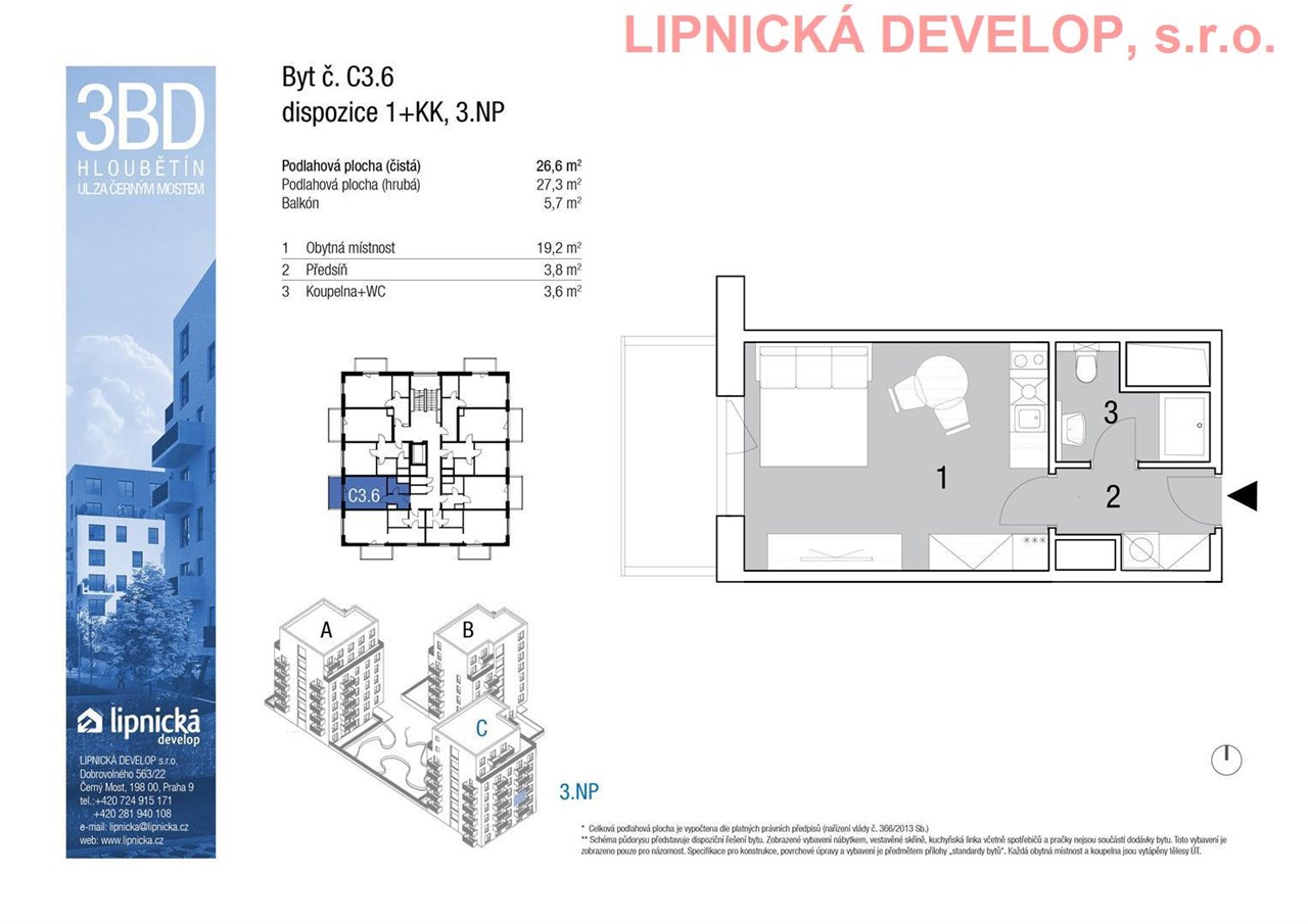 Prodej nového bytu s označením C3.6 o dispozici 1+kk v developerském projektu "NOVOSTAVBA 3 BYTOVÝCH DOMŮ", Hloubětín. Podlahová plocha bytu je 27,3 m2 (užitná plocha bytu je 26,6 m2) + komora o výměře 1,8 m2 + balkón o výměře 5,7 m2. Byt se nachází ve 3. nadzemním podlaží domu. Byt se skládá z obývacího pokoje s kuchyňským koutem, koupelny + WC a předsíně. Z obývacího pokoje je vstup na balkón.