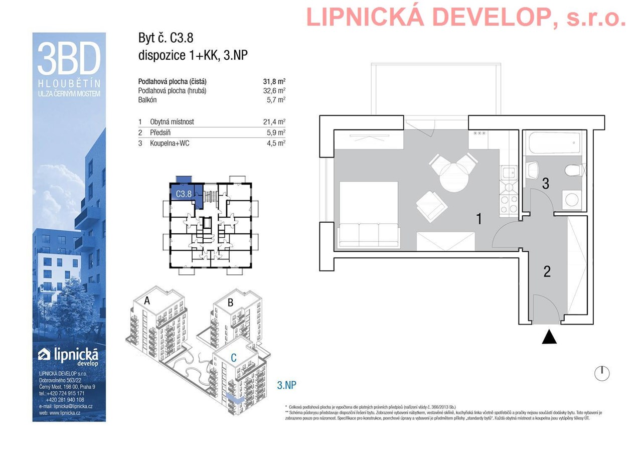 Prodej nového bytu s označením C3.8 o dispozici 1+kk v developerském projektu "NOVOSTAVBA 3 BYTOVÝCH DOMŮ", Hloubětín. Podlahová plocha bytu je 32,6 m2 (užitná plocha bytu je 31,8 m2) + sklepní kóje o výměře 2,1 m2 + balkón o výměře 5,7 m2. Byt se nachází ve 3. nadzemním podlaží domu. Byt se skládá z obývacího pokoje s kuchyňským koutem, koupelny + WC a předsíně. Z obývacího pokoje je vstup na balkón.
