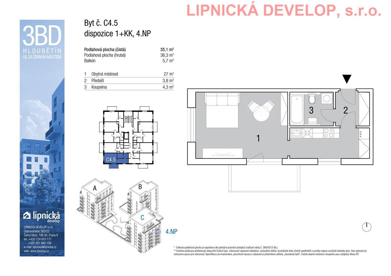 Prodej nového bytu s označením C4.5 o dispozici 1+kk v developerském projektu "NOVOSTAVBA 3 BYTOVÝCH DOMŮ", Hloubětín. Podlahová plocha bytu je 36,3 m2 (užitná plocha bytu je 35,1 m2) + sklepní kóje o výměře 2,1 m2 + balkón o výměře 5,7 m2. Byt se nachází ve 4. nadzemním podlaží domu. Byt se skládá z obývacího pokoje s kuchyňským koutem, koupelny + WC a předsíně. Z obývacího pokoje je vstup na balkón.