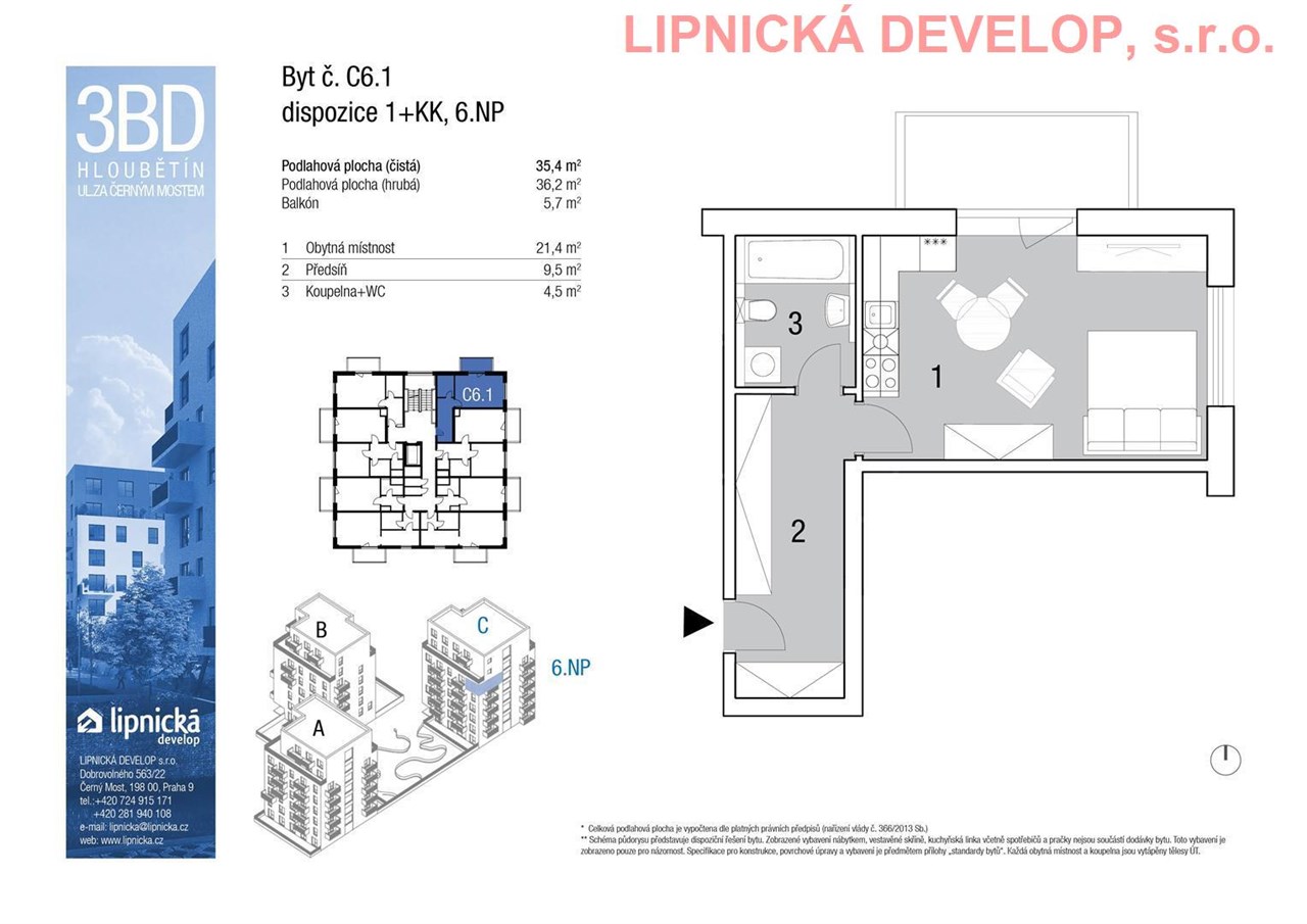 Prodej nového bytu s označením C6.1 o dispozici 1+kk v developerském projektu "NOVOSTAVBA 3 BYTOVÝCH DOMŮ", Hloubětín. Podlahová plocha bytu je 36,2 m2 (užitná plocha bytu je 35,4m2) + sklepní kóje o výměře 2,1 m2 + balkón o výměře 5,7 m2. Byt se nachází v 6. nadzemním podlaží domu. Byt se skládá z obývacího pokoje s kuchyňským koutem, koupelny + WC a předsíně. Z obývacího pokoje je vstup na balkón.