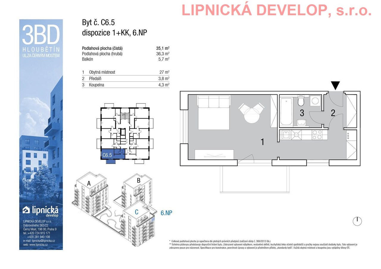 Prodej nového bytu s označením C6.5 o dispozici 1+kk v developerském projektu "NOVOSTAVBA 3 BYTOVÝCH DOMŮ", Hloubětín. Podlahová plocha bytu je 36,3 m2 (užitná plocha bytu je 35,1 m2) + sklepní kóje o výměře 2,1 m2 + balkón o výměře 5,7 m2. Byt se nachází v 6. nadzemním podlaží domu. Byt se skládá z obývacího pokoje s kuchyňským koutem, koupelny + WC a předsíně. Z obývacího pokoje je vstup na balkón. K bytu je třeba dokoupit parkovací stání v ceně 280.000,- Kč vč. DPH, které není v ceně bytu. Parkovací stání je umístěné v 1. podzemním podlaží domu.