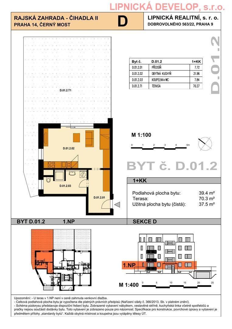 Prodej nového bytu s označení D.01.2 o dispozici 1+kk v developerském projektu AREÁL RAJSKÁ ZAHRADA - ČIHADLA II, BYTOVÉ DOMY "B", "D", PRAHA 9. Byt se nachází v bytovém domě D. Podlahová plocha bytu je 39,4 m2 (užitná plocha bytu je 37,6 m2) + sklepní kóje o výměře 1,9 m2 + zatravněná terasa o výměře 70,3 m2. Byt se nachází v 1. nadzemním podlaží domu. Byt se skládá z obývacího pokoje vč. kuch. koutu, chodby, koupelny + WC.