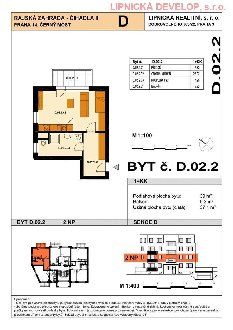 Prodej nového bytu s označení D.02.2 o dispozici 1+kk v developerském projektu AREÁL RAJSKÁ ZAHRADA - ČIHADLA II, BYTOVÉ DOMY "B", "D", PRAHA 9. Byt se nachází v bytovém domě D. Podlahová plocha bytu je 39,0 m2 (užitná plocha bytu je 37,1 m2) + sklepní kóje o výměře 1,9 m2 + balkón o výměře 5,3 m2. Byt se nachází ve 2. nadzemním podlaží domu. Byt se skládá z obývacího pokoje, chodby, koupelny + WC.