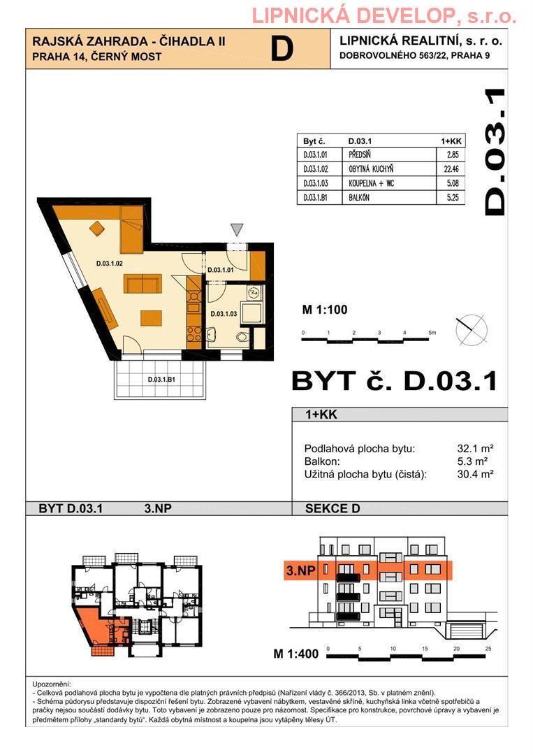 Prodej nového bytu s označení D.03.1 o dispozici 1+kk v developerském projektu AREÁL RAJSKÁ ZAHRADA - ČIHADLA II, BYTOVÉ DOMY "B", "D", PRAHA 9. Byt se nachází v bytovém domě D. Podlahová plocha bytu je 32,1 m2 (užitná plocha bytu je 30,4 m2) + sklepní kóje o výměře 1,9 m2 + balkón o výměře 5,3 m2. Byt se nachází ve 3. nadzemním podlaží domu. Byt se skládá z obývacího pokoje, chodby, koupelny + WC.