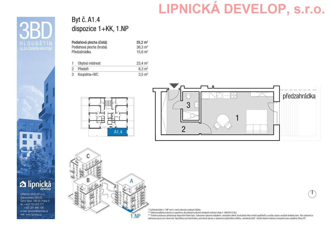 Prodej nového bytu s označením A1.4 o dispozici 1+kk v developerském projektu "NOVOSTAVBA 3 BYTOVÝCH DOMŮ", Hloubětín. Podlahová plocha bytu je 36,3 m2 (užitná plocha bytu je 35,2 m2) + sklepní kóje o výměře 2,1 m2 + předzahrádka o výměře 15,2 m2. Byt se nachází v 1. nadzemním podlaží domu. Byt se skládá z obývacího pokoje s kuchyňským koutem, koupelny + WC a předsíně. Z obývacího pokoje je vstup na předzahrádku.