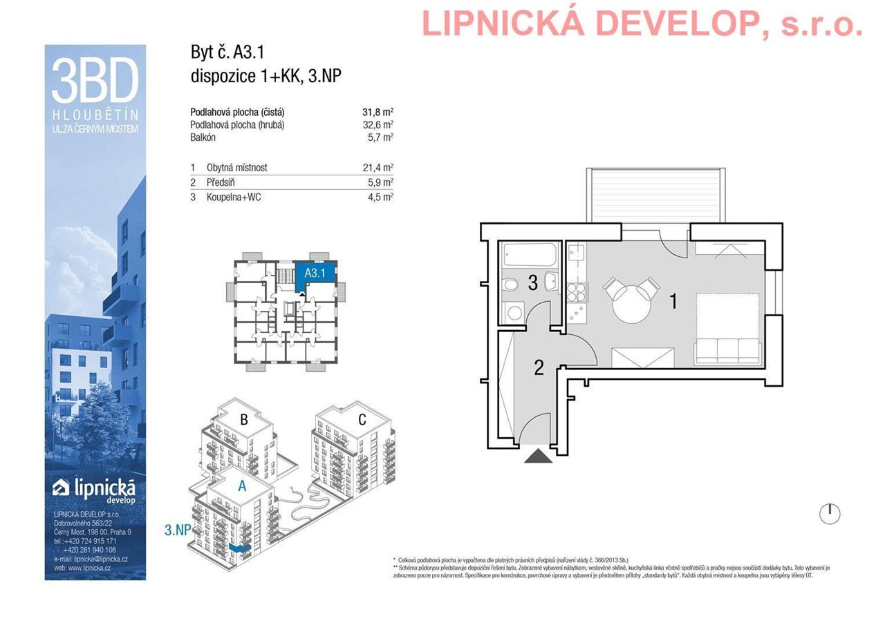 Prodej nového bytu s označením A3.1 o dispozici 1+kk v developerském projektu "NOVOSTAVBA 3 BYTOVÝCH DOMŮ", Hloubětín. Podlahová plocha bytu je 32,6 m2 (užitná plocha bytu je 31,8 m2) + sklepní kóje o výměře 2,1 m2 + balkón o výměře 5,7 m2. Byt se nachází ve 3. nadzemním podlaží bytového domu A. Byt se skládá z obývacího pokoje s kuchyňským koutem, koupelny + WC a předsíně. Z obývacího pokoje je vstup na balkón.