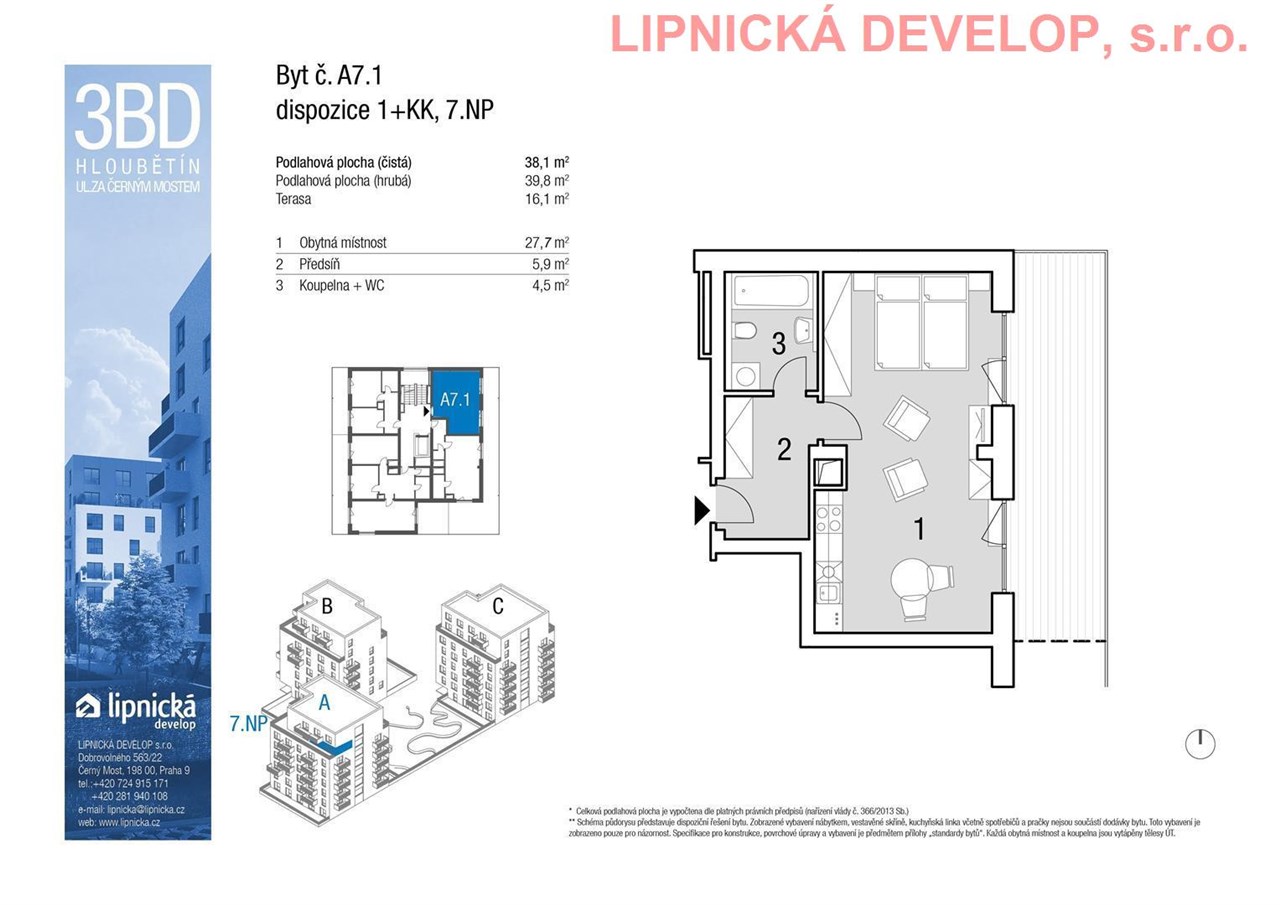 Prodej nového bytu s označením A7.1 o dispozici 1+kk v developerském projektu "NOVOSTAVBA 3 BYTOVÝCH DOMŮ", Hloubětín. Podlahová plocha bytu je 39,8 m2 (užitná plocha bytu je 38,1 m2) + sklepní kóje o výměře 2,2 m2 + terasa o výměře 16,1 m2. Byt se nachází v 7. nadzemním podlaží domu. Byt se skládá z obývacího pokoje s kuchyňským koutem, koupelny + WC a předsíně. Z obývacího pokoje a kuch. koutu je vstup na terasu. K bytu je možné dokoupit parkovací stání, které není v ceně bytu. Parkovací stání je umístěné v 1. podzemním podlaží domu.