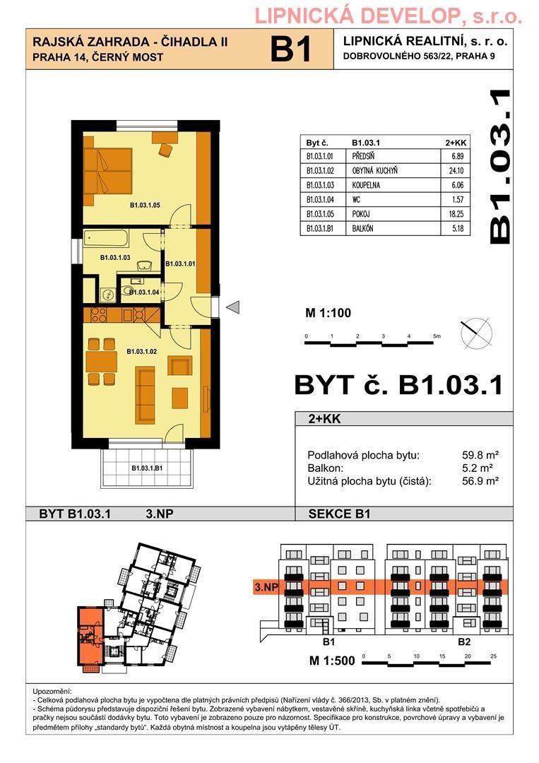 Prodej nového bytu s označení B1.03.1 o dispozici 2+kk v developerském projektu AREÁL RAJSKÁ ZAHRADA - ČIHADLA II, BYTOVÉ DOMY "B", "D", PRAHA 9. Byt se nachází v bytovém domě B. Podlahová plocha bytu je 59,8 m2 (užitná plocha bytu je 56,9 m2) + sklepní kóje o výměře 1,7 m2 + balkon o výměře 5,2 m2. Byt se nachází ve 3. nadzemním podlaží domu. Byt se skládá z obývacího pokoje, ložnice, chodby, koupelny a WC.
