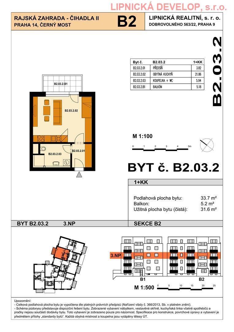 Prodej nového bytu s označení B2.03.2 o dispozici 1+kk v developerském projektu AREÁL RAJSKÁ ZAHRADA - ČIHADLA II, BYTOVÉ DOMY "B", "D", PRAHA 9. Byt se nachází v bytovém domě B. Podlahová plocha bytu je 33,7 m2 (užitná plocha bytu je 31,6 m2) + sklepní kóje o výměře 1,6 m2 + balkón o výměře 5,2 m2. Byt se nachází ve 3. nadzemním podlaží domu. Byt se skládá z obývacího pokoje, chodby, koupelny s WC.