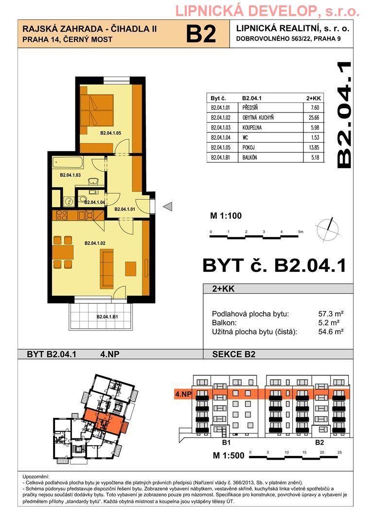 Prodej nového bytu s označení B2.04.1 o dispozici 2+kk v developerském projektu AREÁL RAJSKÁ ZAHRADA - ČIHADLA II, BYTOVÉ DOMY "B", "D", PRAHA 9. Byt se nachází v bytovém domě B. Podlahová plocha bytu je 57,3 m2 (užitná plocha bytu je 54,6 m2) + sklepní kóje o výměře 1,6 m2 + balkon o výměře 5,2 m2. Byt se nachází ve 4. nadzemním podlaží domu. Byt se skládá z obývacího pokoje, ložnice, chodby, koupelny a WC.