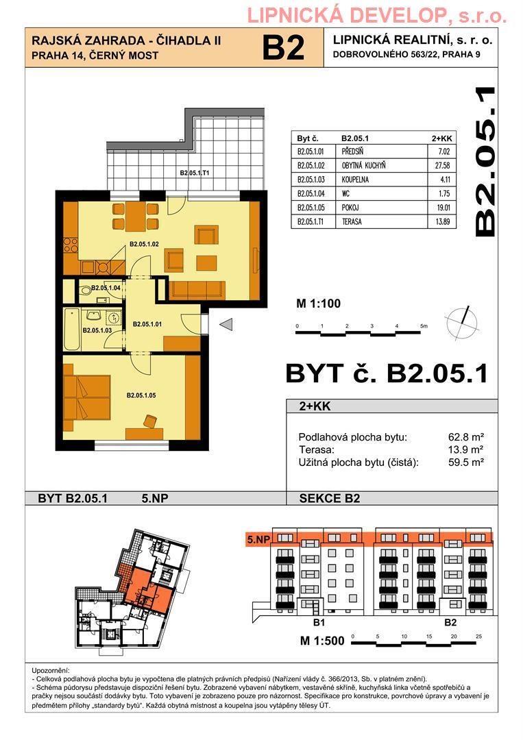 Prodej nového bytu s označení B2.05.1 o dispozici 2+kk v developerském projektu AREÁL RAJSKÁ ZAHRADA - ČIHADLA II, BYTOVÉ DOMY "B", "D", PRAHA 9. Byt se nachází v bytovém domě B. Podlahová plocha bytu je 62,8 m2 (užitná plocha bytu je 59,5 m2) + sklepní o výměře 4,1 m2 + terasa o výměře 13,9 m2. Byt se nachází v 5. nadzemním podlaží domu. Byt se skládá z obývacího pokoje, ložnice, chodby, koupelny a WC.