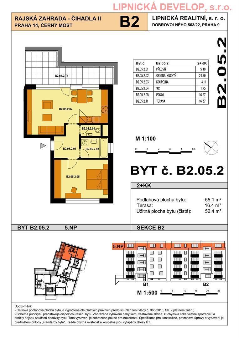 Prodej nového bytu s označení B2.05.2 o dispozici 2+kk v developerském projektu AREÁL RAJSKÁ ZAHRADA - ČIHADLA II, BYTOVÉ DOMY "B", "D", PRAHA 9. Byt se nachází v bytovém domě B. Podlahová plocha bytu je 55,1 m2 (užitná plocha bytu je 52,4 m2) + sklepní kóje o výměře 1,5 m2 + terasa o výměře 16,4 m2. Byt se nachází v 5. nadzemním podlaží domu. Byt se skládá z obývacího pokoje, ložnice, chodby, koupelny a WC.