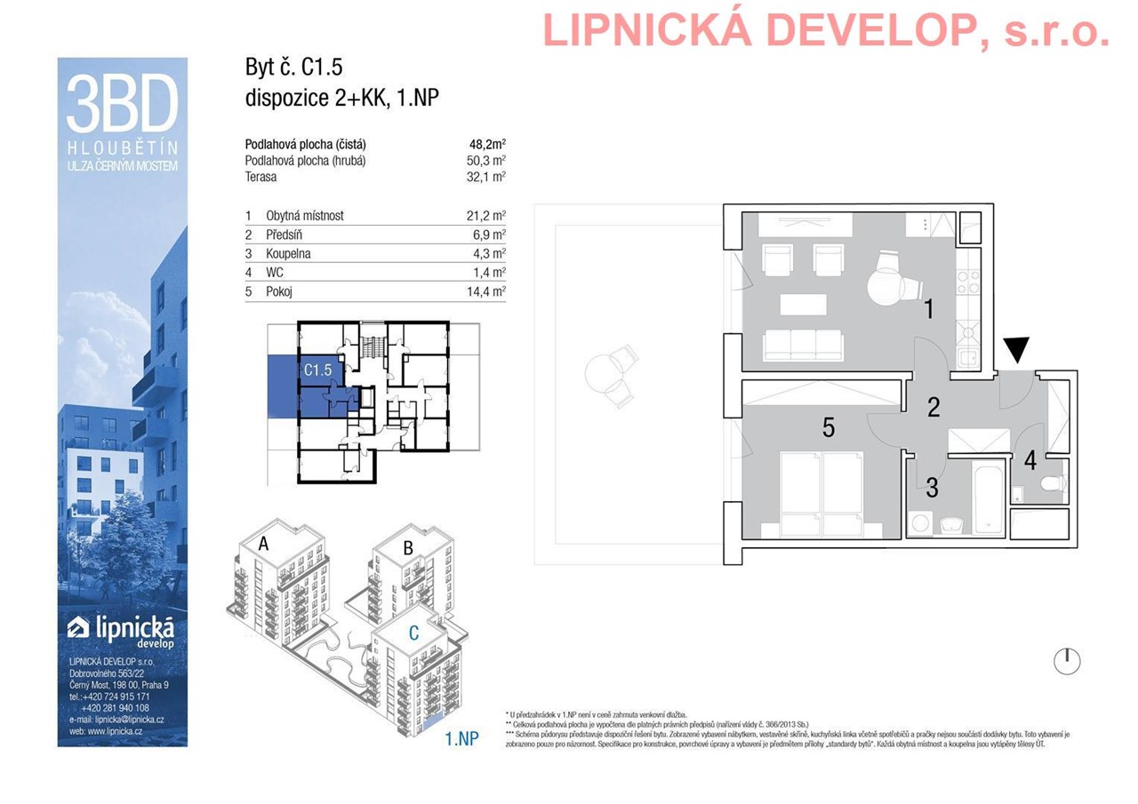 Prodej nového bytu s označením C1.5 o dispozici 2+kk v developerském projektu "NOVOSTAVBA 3 BYTOVÝCH DOMŮ", Hloubětín. Podlahová plocha bytu je 50,3 m2 (užitná plocha bytu je 48,2 m2) + sklepní kóje o výměře 2,1 m2 + zatravněná terasa (předzahrádka) o výměře 32,1 m2. Byt se nachází v 1. nadzemním podlaží domu. Byt se skládá z obývacího pokoje s kuchyňským koutem, ložnice, koupelny, WC a předsíně. Z obývacího pokoje je vstup na zatravněnou terasu (předzahrádku). K bytu je třeba dokoupit parkovací stání v zakladači v ceně 280.000,- Kč vč. DPH, které není v ceně bytu. Parkovací stání je umístěné v 1. podzemním podlaží domu.