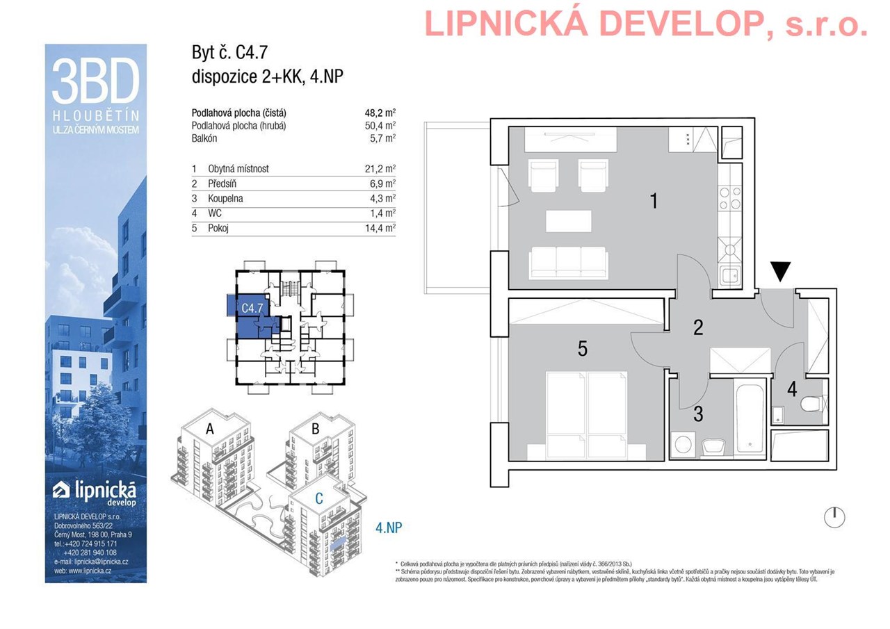 Prodej nového bytu s označením C4.7 o dispozici 2+kk v developerském projektu "NOVOSTAVBA 3 BYTOVÝCH DOMŮ", Hloubětín. Podlahová plocha bytu je 50,4 m2 (užitná plocha bytu je 48,2 m2) + sklepní kóje o výměře 2,1 m2 + balkón o výměře 5,7 m2. Byt se nachází ve 4. nadzemním podlaží domu. Byt se skládá z obývacího pokoje s kuchyňským koutem, ložnice, koupelny, WC a chodby. Z obývacího pokoje je vstup na balkón. K bytu je třeba dokoupit parkovací stání v zakladači v ceně 280.000,- Kč vč. DPH, které není v ceně bytu. Parkovací stání je umístěné v 1. podzemním podlaží domu.