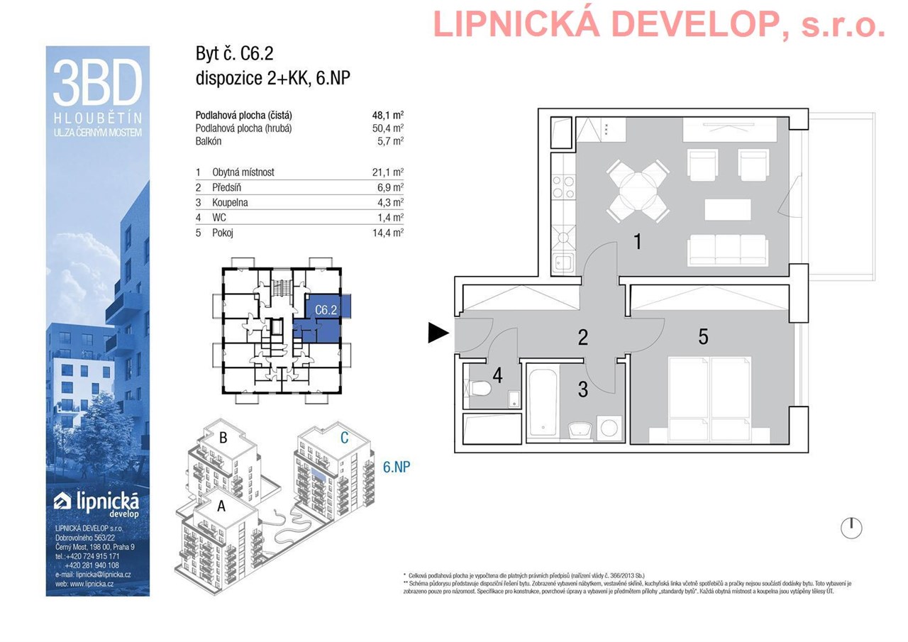 Prodej nového bytu s označením C6.2 o dispozici 2+kk v developerském projektu "NOVOSTAVBA 3 BYTOVÝCH DOMŮ", Hloubětín. Podlahová plocha bytu je 50,4 m2 (užitná plocha bytu je 48,1 m2) + sklepní kóje o výměře 3,2 m2 + balkón o výměře 5,7 m2. Byt se nachází v 6. nadzemním podlaží domu. Byt se skládá z obývacího pokoje s kuchyňským koutem, koupelny + WC a předsíně. Z obývacího pokoje je vstup na balkón. K bytu je třeba dokoupit parkovací stání v ceně 280.000,- Kč vč. DPH, které není v ceně bytu. Parkovací stání je umístěné v 1. podzemním podlaží domu.