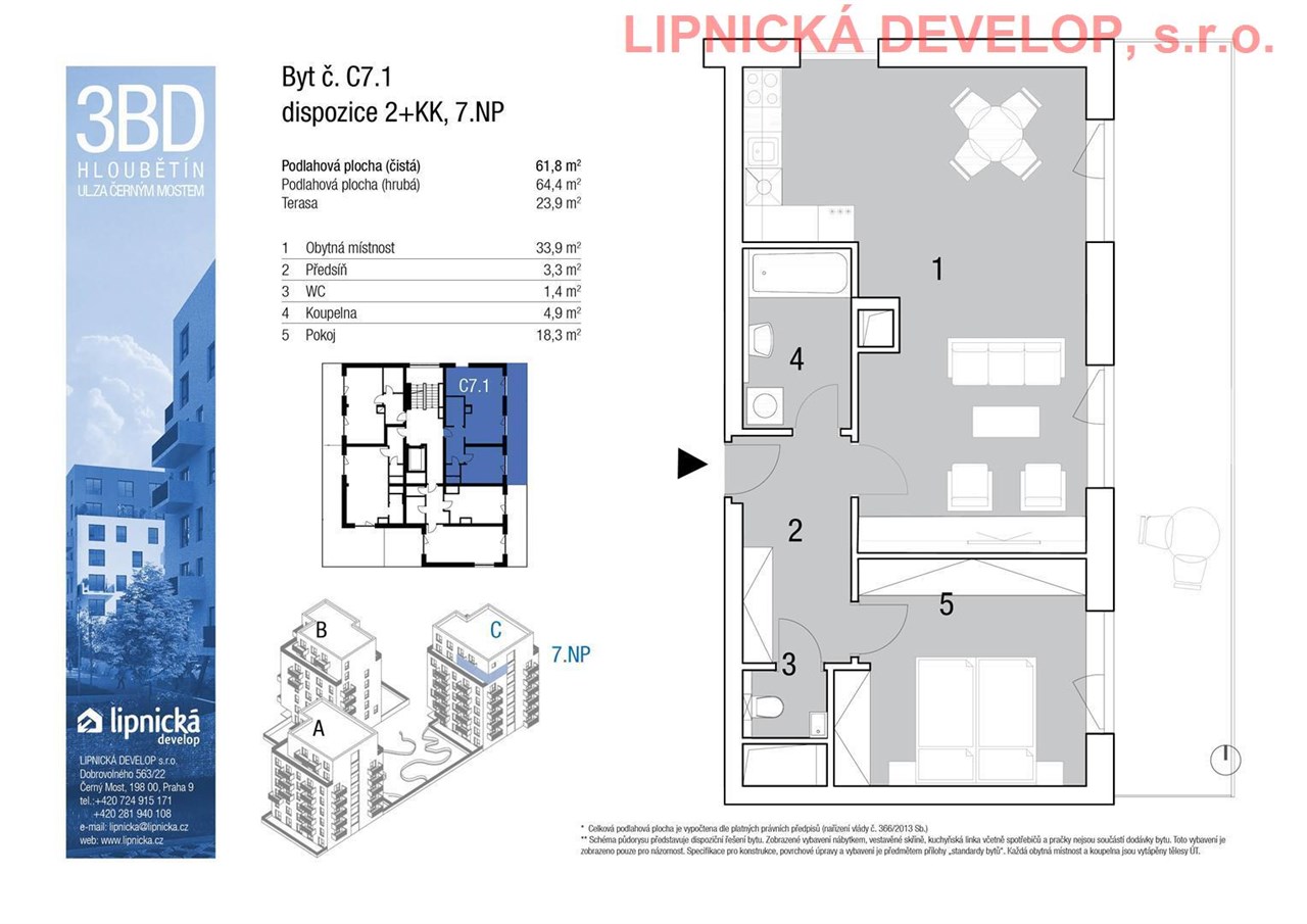 Prodej nového bytu s označením C7.1 o dispozici 2+kk v developerském projektu "NOVOSTAVBA 3 BYTOVÝCH DOMŮ", Hloubětín. Podlahová plocha bytu je 64,4 m2 (užitná plocha bytu je 61,8 m2) + sklep o výměře 4,2 m2 + terasa o výměře 23,9 m2. Byt se nachází v 7. nadzemním podlaží domu. Byt se skládá z obývacího pokoje s kuchyňským koutem, ložnice, koupelny, WC a předsíně. Z obývacího pokoje a ložnice je vstup na terasu. K bytu je třeba dokoupit uzavřené parkovací stání v ceně 400.000,- Kč vč. DPH, které není v ceně bytu. Parkovací stání je umístěné v 1. podzemním podlaží domu.