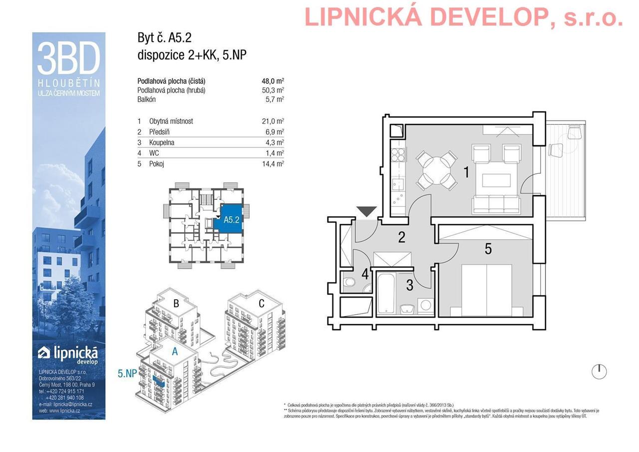 Prodej nového bytu s označením A5.2 o dispozici 2+kk v developerském projektu "NOVOSTAVBA 3 BYTOVÝCH DOMŮ", Hloubětín. Podlahová plocha bytu je 50,3 m2 (užitná plocha bytu je 48,0 m2) + sklepní kóje o výměře 2,1 m2 + balkón o výměře 5,7 m2. Byt se nachází v 5. nadzemním podlaží domu. Byt se skládá z obývacího pokoje s kuchyňským koutem, ložnice, koupelny, WC a předsíně. Z obývacího pokoje je vstup na balkón. K bytu je třeba dokoupit parkovací stání, které není v ceně bytu. Parkovací stání je umístěné v 1. podzemním podlaží domu.