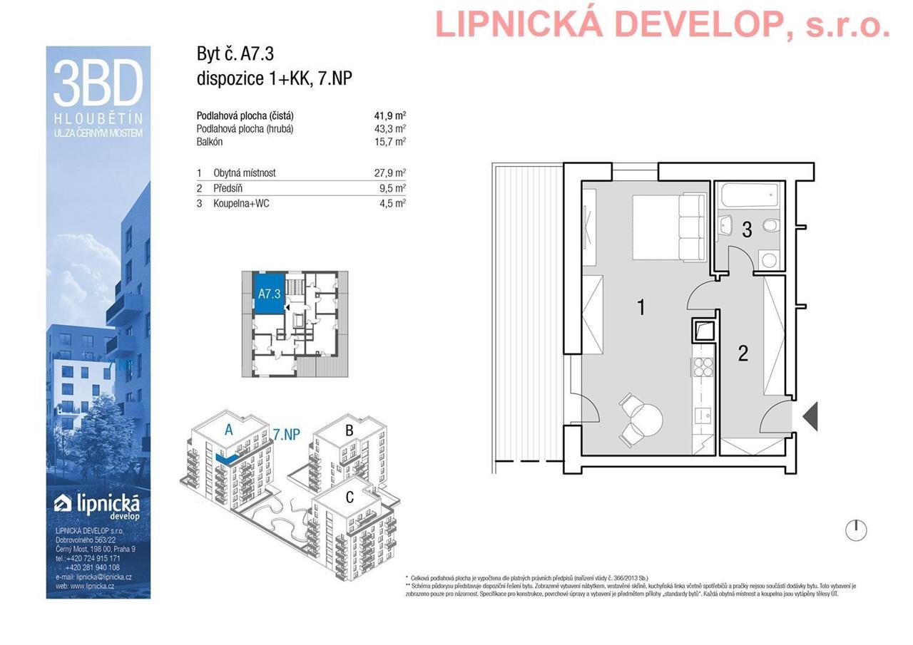 Prodej nového bytu s označením A7.3 o dispozici 1+kk v developerském projektu "NOVOSTAVBA 3 BYTOVÝCH DOMŮ", Hloubětín. Podlahová plocha bytu je 43,9 m2 (užitná plocha bytu je 41,2 m2) + sklepní kóje o výměře 2,1 m2 + terasa o výměře 15,6 m2. Byt se nachází v 7. nadzemním podlaží domu. Byt se skládá z obývacího pokoje s kuchyňským koutem, koupelny + WC a předsíně. Z obývacího pokoje je vstup na terasu. K bytu je třeba dokoupit parkovací stání, které není v ceně bytu. Parkovací stání je umístěné v 1. podzemním podlaží domu.