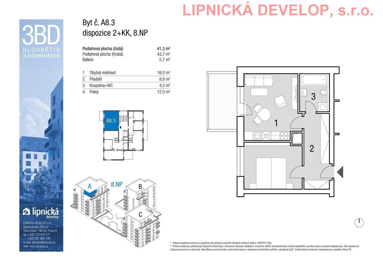 Prodej nového bytu s označením A8.3 o dispozici 2+kk v developerském projektu "NOVOSTAVBA 3 BYTOVÝCH DOMŮ", Hloubětín. Podlahová plocha bytu je 43,0 m2 (užitná plocha bytu je 41,3 m2) + sklepní kóje o výměře 2,1 m2 + balkón o výměře 5,7 m2. Byt se nachází v 8. nadzemním podlaží domu. Byt se skládá z obývacího pokoje s kuchyňským koutem, ložnice, koupelny + WC a předsíně. Z obývacího pokoje je vstup na balkón. K bytu je třeba dokoupit parkovací stání, které není v ceně bytu. Parkovací stání je umístěné v 1. podzemním podlaží domu.