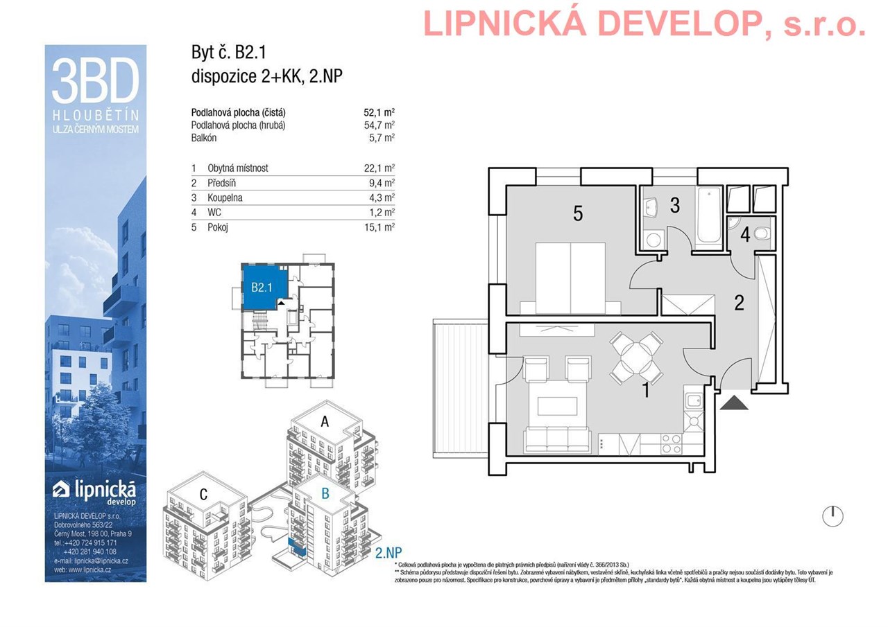 Prodej nového bytu s označením B2.1 o dispozici 2+kk v developerském projektu "NOVOSTAVBA 3 BYTOVÝCH DOMŮ", Hloubětín. Podlahová plocha bytu je 54,7 m2 (užitná plocha bytu je 52,1 m2) + sklepní kóje o výměře 2,1 m2 + balkón o výměře 5,7 m2. Byt se nachází ve 2. nadzemním podlaží domu. Byt se skládá z obývacího pokoje s kuchyňským koutem, ložnice, koupelny, WC a předsíně. Z obývacího pokoje je vstup na balkón. K bytu je třeba dokoupit parkovací stání, které není v ceně bytu. Parkovací stání je umístěné v 1. podzemním podlaží domu.