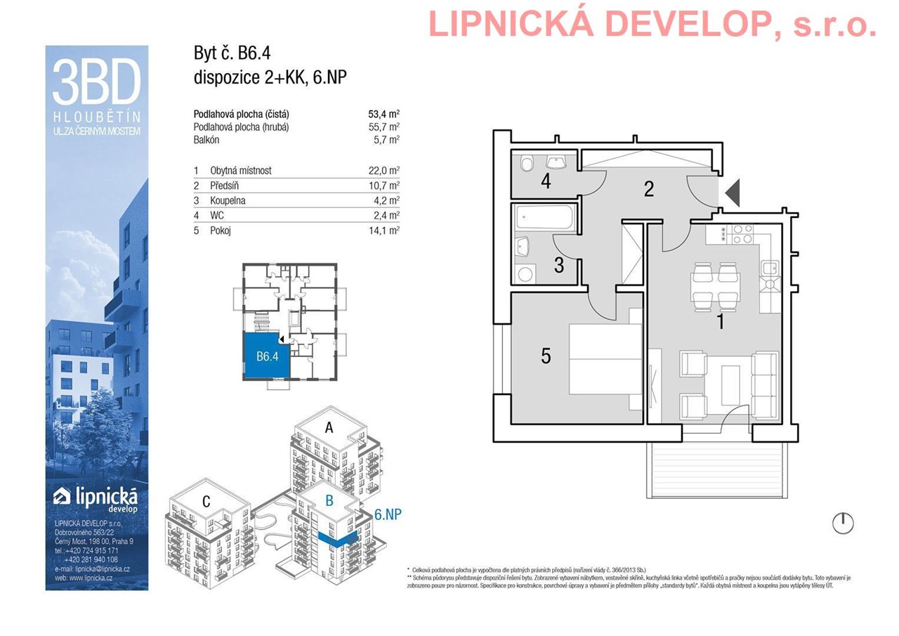Prodej nového bytu s označením B6.4 o dispozici 2+kk v developerském projektu "NOVOSTAVBA 3 BYTOVÝCH DOMŮ", Hloubětín. Podlahová plocha bytu je 55,7 m2 (užitná plocha bytu je 53,4 m2) + sklepní kóje o výměře 2,1 m2 + balkón o výměře 5,7 m2. Byt se nachází v 6. nadzemním podlaží domu. Byt se skládá z obývacího pokoje s kuchyňským koutem, ložnice, koupelny, WC a předsíně. Z obývacího pokoje je vstup na balkón. K bytu je třeba dokoupit parkovací stání, které není v ceně bytu. Parkovací stání je umístěné v 1. podzemním podlaží domu.