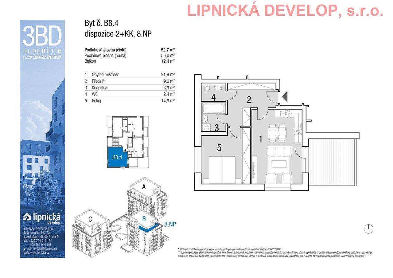 Prodej nového bytu s označením B8.4 o dispozici 2+kk v developerském projektu "NOVOSTAVBA 3 BYTOVÝCH DOMŮ", Hloubětín. Podlahová plocha bytu je 55,0 m2 (užitná plocha bytu je 52,7 m2) + balkón o výměře 12,2 m2. Byt se nachází v 8. nadzemním podlaží domu. Byt se skládá z obývacího pokoje s kuchyňským koutem, ložnice, koupelny + WC a předsíně. Z obývacího pokoje je vstup na balkón. K bytu je třeba dokoupit parkovací stání, které není v ceně bytu. Parkovací stání je umístěné v 1. podzemním podlaží domu.