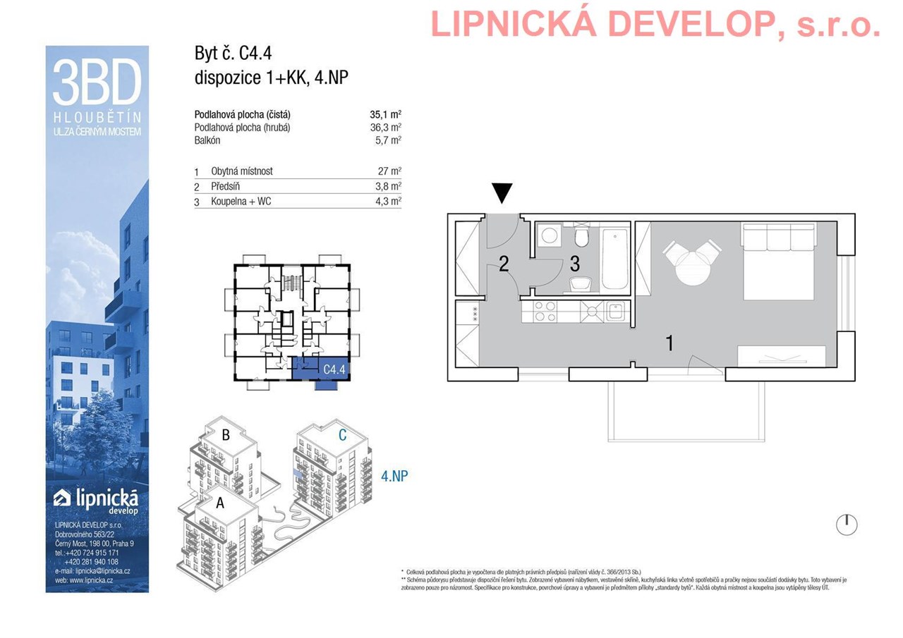 Prodej nového bytu s označením C4.4 o dispozici 1+kk v developerském projektu "NOVOSTAVBA 3 BYTOVÝCH DOMŮ", Hloubětín. Podlahová plocha bytu je 36,3 m2 (užitná plocha bytu je 35,1 m2) + sklepní kóje o výměře 2,1 m2 + balkón o výměře 5,7 m2. Byt se nachází ve 4. nadzemním podlaží domu. Byt se skládá z obývacího pokoje s kuchyňským koutem, koupelny + WC a předsíně. Z obývacího pokoje je vstup na balkón.