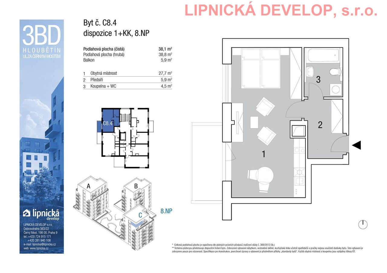 Prodej nového bytu s označením C8.4 o dispozici 1+kk v developerském projektu "NOVOSTAVBA 3 BYTOVÝCH DOMŮ", Hloubětín. Podlahová plocha bytu je 38,8 m2 (užitná plocha bytu je 38,1 m2) + sklepní kóje o výměře 3,2 m2 + balkón o výměře 5,9 m2. Byt se nachází v 8. nadzemním podlaží domu. Byt se skládá z obývacího pokoje s kuchyňským koutem, koupelny + WC a předsíně. Z obývacího pokoje je vstup na balkón. K bytu je třeba dokoupit parkovací stání v ceně 280.000,- Kč vč. DPH, které není v ceně bytu. Parkovací stání je umístěné v 1. podzemním podlaží domu.