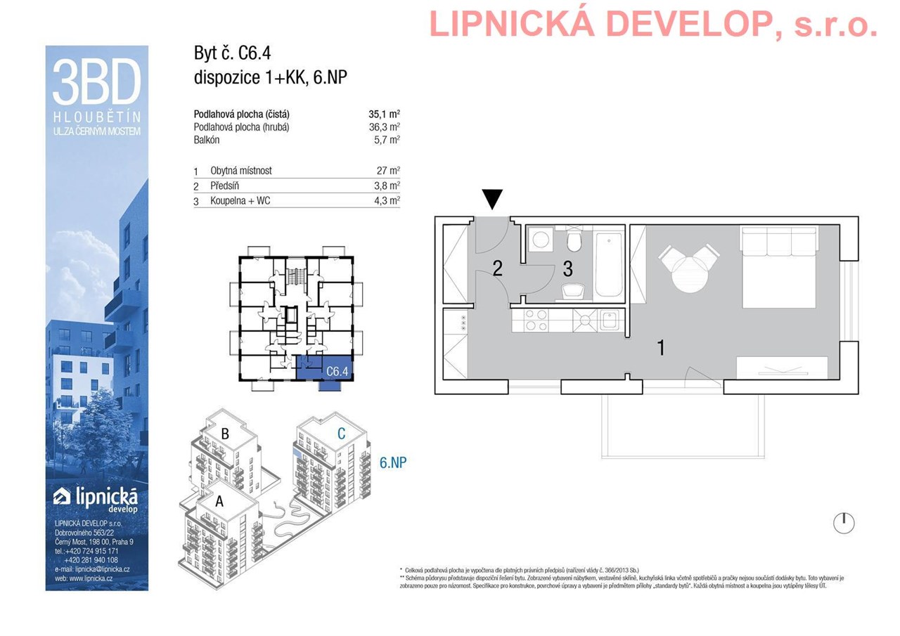 Prodej nového bytu s označením C6.4 o dispozici 1+kk v developerském projektu "NOVOSTAVBA 3 BYTOVÝCH DOMŮ", Hloubětín. Podlahová plocha bytu je 36,3 m2 (užitná plocha bytu je 35,1 m2) + sklepní kóje o výměře 2,1 m2 + balkón o výměře 5,7 m2. Byt se nachází v 6. nadzemním podlaží domu. Byt se skládá z obývacího pokoje s kuchyňským koutem, koupelny + WC a předsíně. Z obývacího pokoje je vstup na balkón.