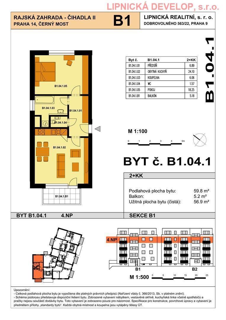 Prodej nového bytu s označení B1.04.1 o dispozici 2+kk v developerském projektu AREÁL RAJSKÁ ZAHRADA - ČIHADLA II, BYTOVÉ DOMY "B", "D", PRAHA 9. Byt se nachází v bytovém domě B. Podlahová plocha bytu je 59,8 m2 (užitná plocha bytu je 56,9 m2) + sklepní kóje o výměře 1,9 m2 + balkon o výměře 5,2 m2. Byt se nachází ve 4. nadzemním podlaží domu. Byt se skládá z obývacího pokoje, ložnice, chodby, koupelny a WC.