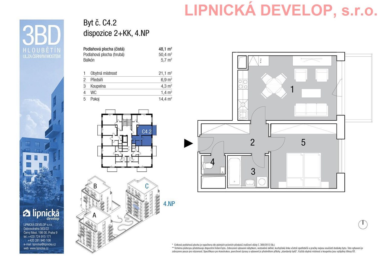 Prodej nového bytu s označením C4.2 o dispozici 2+kk v developerském projektu "NOVOSTAVBA 3 BYTOVÝCH DOMŮ", Hloubětín. Podlahová plocha bytu je 50,4 m2 (užitná plocha bytu je 48,1 m2) + sklepní kóje o výměře 2,1 m2 + balkón o výměře 5,7 m2. Byt se nachází ve 4. nadzemním podlaží domu. Byt se skládá z obývacího pokoje s kuchyňským koutem, ložnice, koupelny, WC a předsíně. Z obývacího pokoje je vstup na balkón. K bytu je třeba dokoupit parkovací stání v zakladači v ceně 280.000,- Kč vč. DPH, které není v ceně bytu. Parkovací stání je umístěné v 1. podzemním podlaží domu.