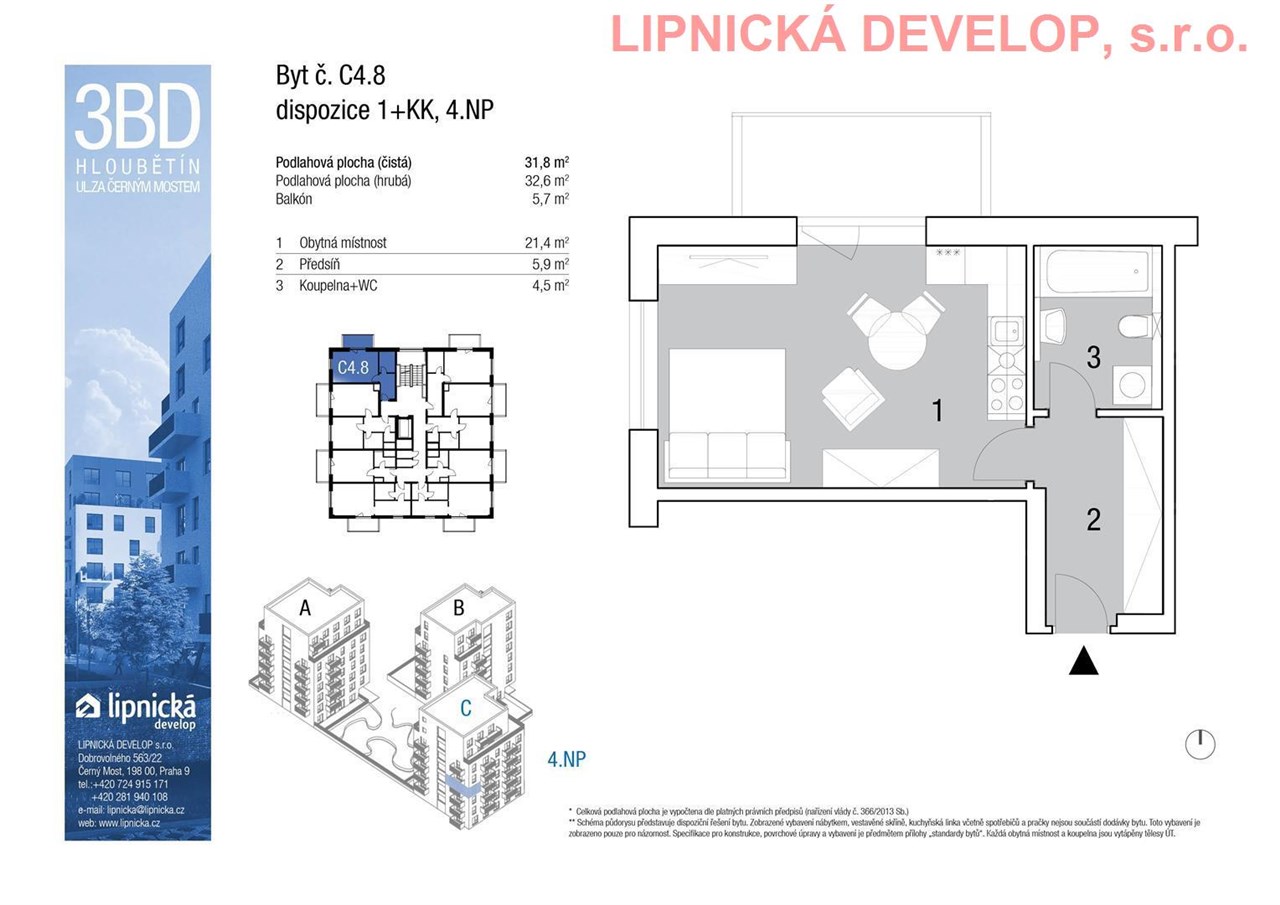 Prodej nového bytu s označením C4.8 o dispozici 1+kk v developerském projektu "NOVOSTAVBA 3 BYTOVÝCH DOMŮ", Hloubětín. Podlahová plocha bytu je 32,6 m2 (užitná plocha bytu je 31,8 m2) + sklepní kóje o výměře 2,1 m2 + balkón o výměře 5,7 m2. Byt se nachází ve 4. nadzemním podlaží domu. Byt se skládá z obývacího pokoje s kuchyňským koutem, koupelny + WC a předsíně. Z obývacího pokoje je vstup na balkón.