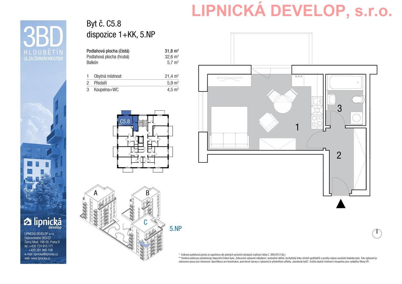 Prodej nového bytu s označením C5.8 o dispozici 1+kk v developerském projektu "NOVOSTAVBA 3 BYTOVÝCH DOMŮ", Hloubětín. Podlahová plocha bytu je 32,6 m2 (užitná plocha bytu je 31,8 m2) + sklepní kóje o výměře 2,1 m2 + balkón o výměře 5,7 m2. Byt se nachází v 5. nadzemním podlaží domu. Byt se skládá z obývacího pokoje s kuchyňským koutem, koupelny + WC a předsíně. Z obývacího pokoje je vstup na balkón.