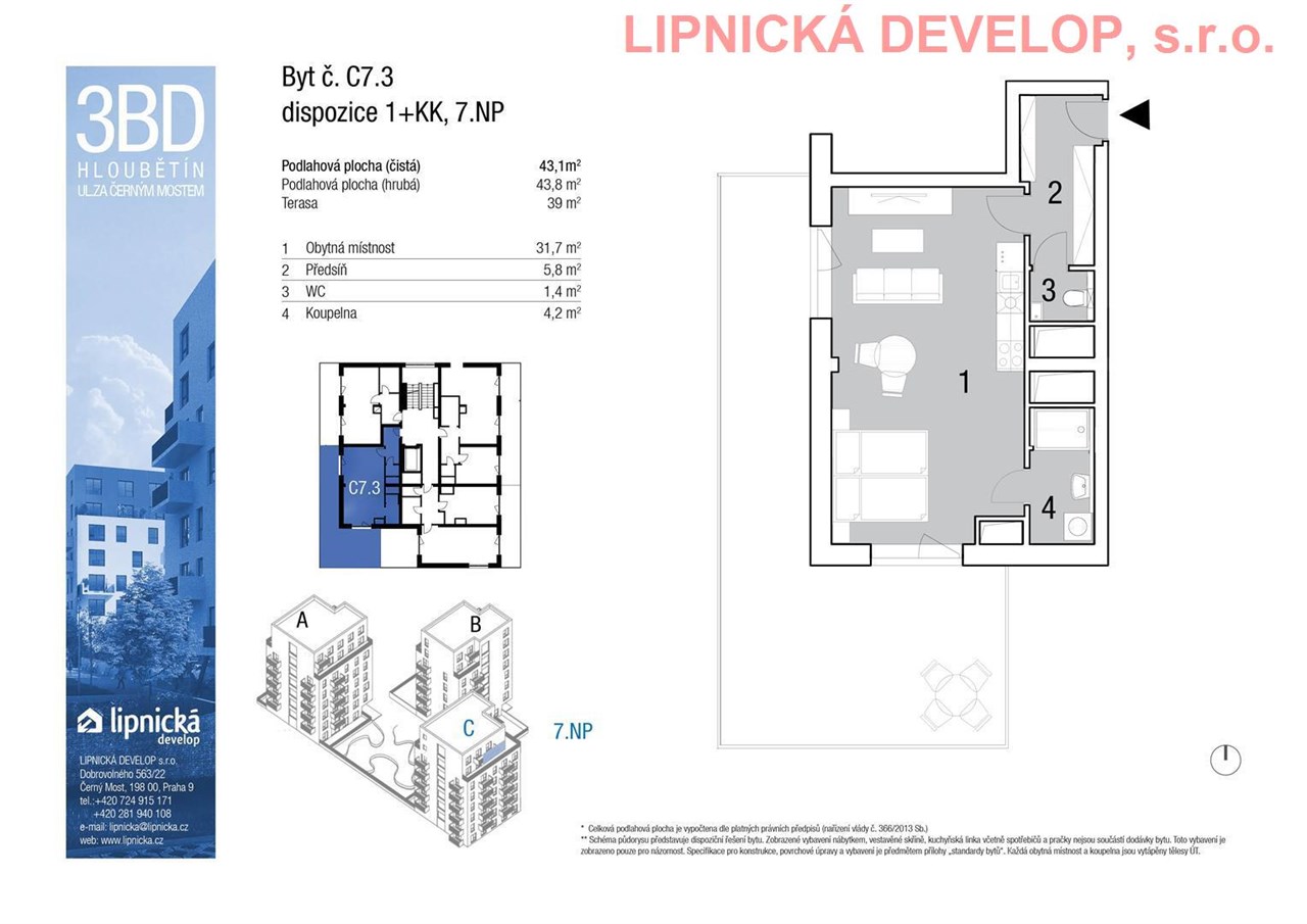Prodej nového bytu s označením C7.3 o dispozici 1+kk v developerském projektu "NOVOSTAVBA 3 BYTOVÝCH DOMŮ", Hloubětín. Podlahová plocha bytu je 43,8 m2 (užitná plocha bytu je 43,1 m2) + sklep o výměře 2,2 m2 + terasa o výměře 39,0 m2. Byt se nachází v 7. nadzemním podlaží domu. Byt se skládá z obývacího pokoje s kuchyňským koutem, koupelny, WC a předsíně. Z obývacího pokoje je vstup na terasu. K bytu je třeba dokoupit parkovací stání v parkliftu v ceně 280.000,- Kč vč. DPH, které není v ceně bytu. Parkovací stání je umístěné v 1. podzemním podlaží domu.