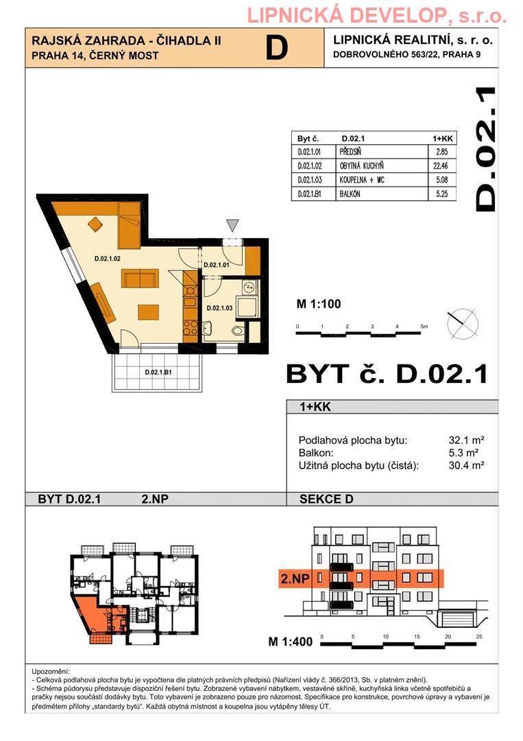 Prodej nového bytu s označení D.02.1 o dispozici 1+kk v developerském projektu AREÁL RAJSKÁ ZAHRADA - ČIHADLA II, BYTOVÉ DOMY "B", "D", PRAHA 9. Byt se nachází v bytovém domě D. Podlahová plocha bytu je 32,1 m2 (užitná plocha bytu je 30,4 m2) + sklepní kóje o výměře 1,9 m2 + balkón o výměře 5,3 m2. Byt se nachází ve 2. nadzemním podlaží domu. Byt se skládá z obývacího pokoje, chodby, koupelny + WC.