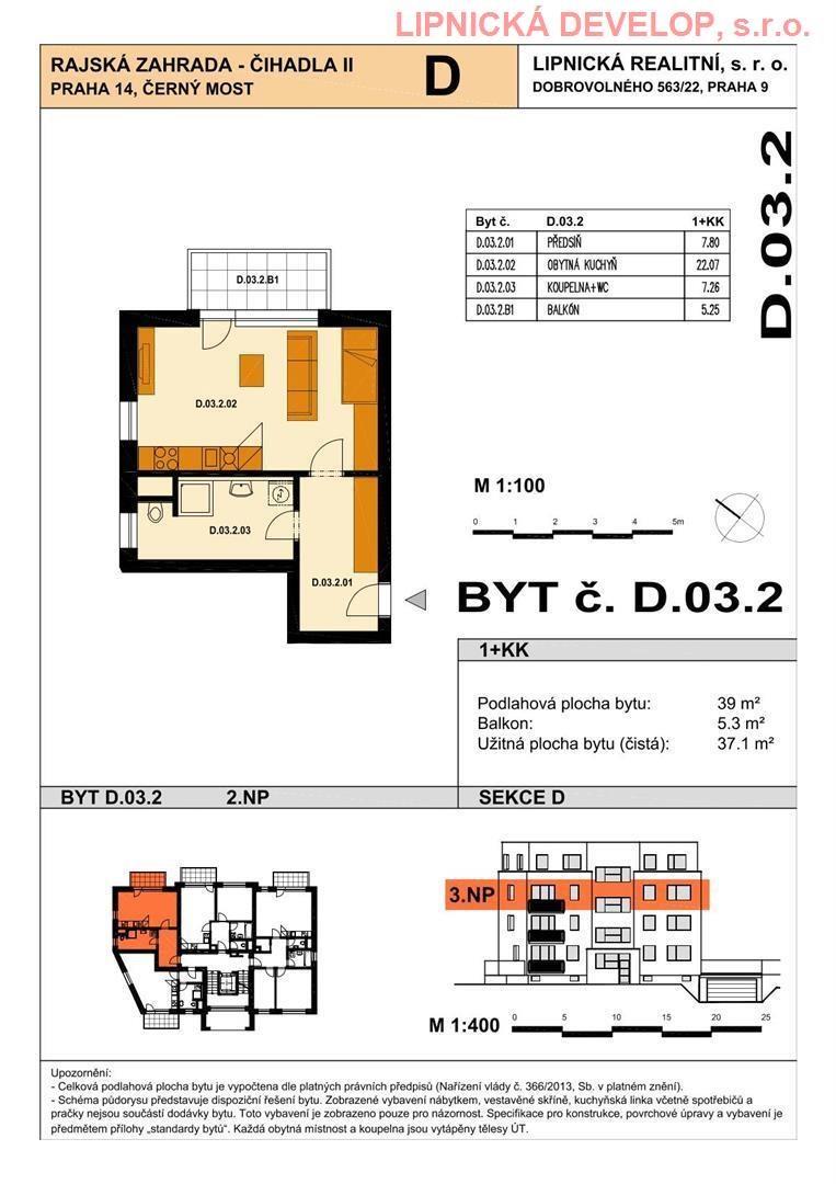 Prodej nového bytu s označení D.03.2 o dispozici 1+kk v developerském projektu AREÁL RAJSKÁ ZAHRADA - ČIHADLA II, BYTOVÉ DOMY "B", "D", PRAHA 9. Byt se nachází v bytovém domě D. Podlahová plocha bytu je 39,0 m2 (užitná plocha bytu je 37,1 m2) + sklepní kóje o výměře 1,9 m2 + balkón o výměře 5,3 m2. Byt se nachází ve 3. nadzemním podlaží domu. Byt se skládá z obývacího pokoje, chodby, koupelny + WC.