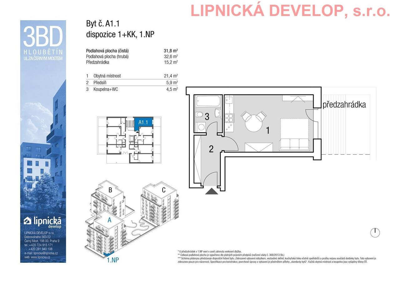 Prodej nového bytu s označením A1.1 o dispozici 1+kk v developerském projektu "NOVOSTAVBA 3 BYTOVÝCH DOMŮ", Hloubětín. Podlahová plocha bytu je 32,6 m2 (užitná plocha bytu je 31,8 m2) + sklepní kóje o výměře 2,1 m2 + předzahrádka o výměře 15,6 m2. Byt se nachází v 1. nadzemním podlaží domu. Byt se skládá z obývacího pokoje s kuchyňským koutem, koupelny + WC a předsíně. Z obývacího pokoje je vstup na předzahrádku.