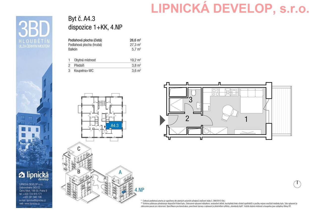 Prodej nového bytu s označením A4.3 o dispozici 1+kk v developerském projektu "NOVOSTAVBA 3 BYTOVÝCH DOMŮ", Hloubětín. Podlahová plocha bytu je 27,3 m2 (užitná plocha bytu je 26,6 m2) + sklepní kóje o výměře 1,5 m2 + balkón o výměře 5,7 m2. Byt se nachází ve 4. nadzemním podlaží bytového domu A. Byt se skládá z obývacího pokoje s kuchyňským koutem, ložnice, koupelny + WC a předsíně. Z obývacího pokoje je vstup na balkón. K bytu je možné dokoupit parkovací stání, které není v ceně bytu. Parkovací stání je umístěné v 1. podzemním podlaží domu.