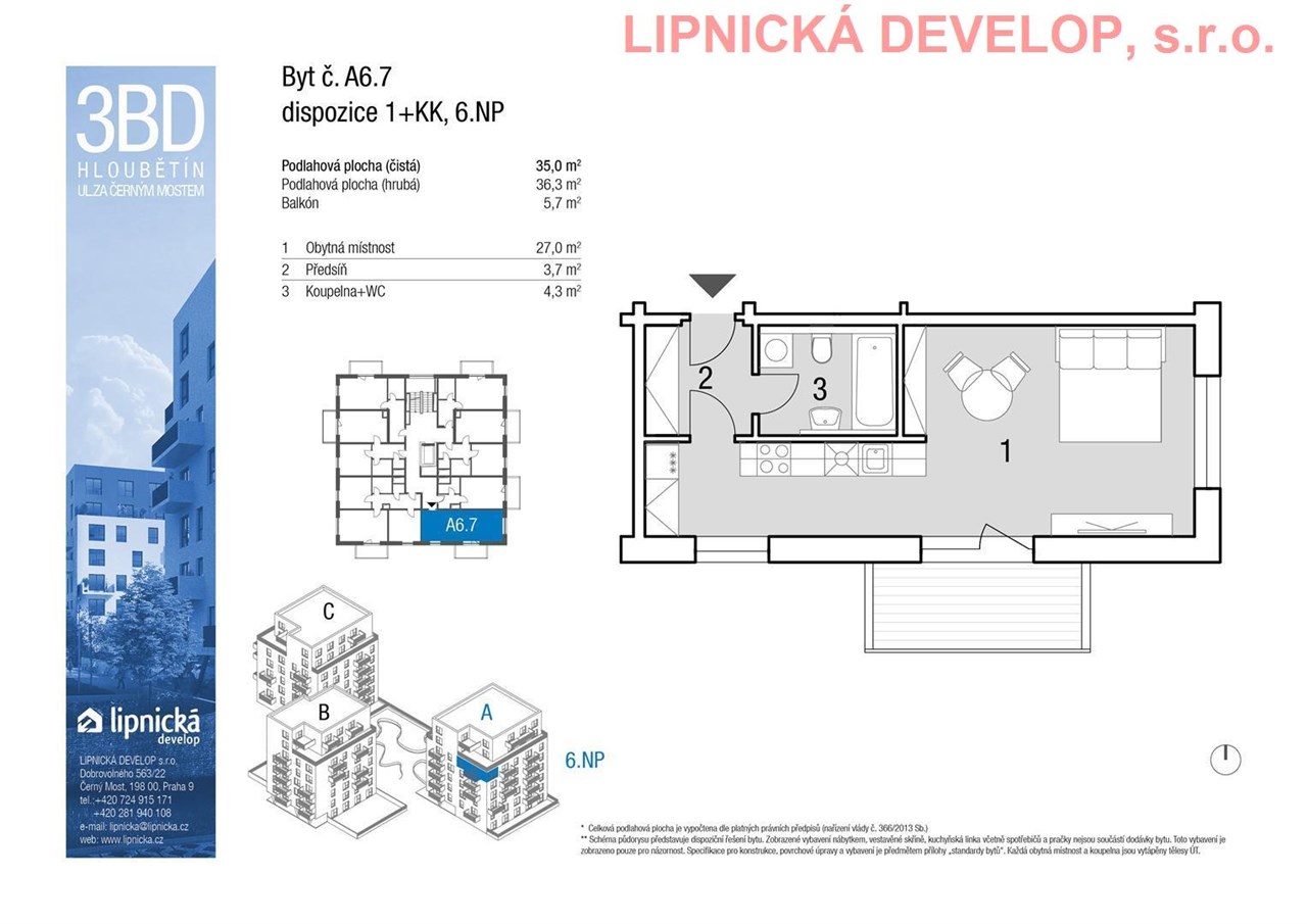 Prodej nového bytu s označením A6.7 o dispozici 1+kk v developerském projektu "NOVOSTAVBA 3 BYTOVÝCH DOMŮ", Hloubětín. Podlahová plocha bytu je 36,3 m2 (užitná plocha bytu je 35,0 m2) + sklepní kóje o výměře 2,1 m2 + balkón o výměře 5,7 m2. Byt se nachází v 6. nadzemním podlaží domu. Byt se skládá z obývacího pokoje s kuchyňským koutem, koupelny + WC a předsíně. Z obývacího pokoje je vstup na balkón. K bytu je možné dokoupit parkovací stání, které není v ceně bytu. Parkovací stání je umístěné v 1. podzemním podlaží domu.