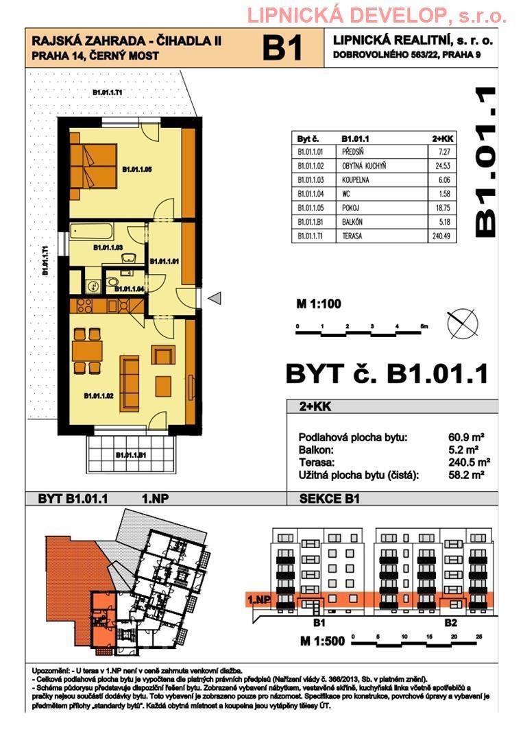 Prodej nového bytu s označení B1.01.1 o dispozici 2+kk v developerském projektu AREÁL RAJSKÁ ZAHRADA - ČIHADLA II, BYTOVÉ DOMY "B", "D", PRAHA 9. Byt se nachází v bytovém domě B. Podlahová plocha bytu je 60,9 m2 (užitná plocha bytu je 58,2 m2) + sklepní kóje o výměře 1,7 m2 + balkon o výměře 5,2 m2 + zatravněná terasa (předzahrádka) o výměře 240,5 m2. Byt se nachází v 1. nadzemním podlaží domu. Byt se skládá z obývacího pokoje, ložnice, chodby, koupelny a WC. Výhodou tohoto bytu je veliká zatravněná terasa.