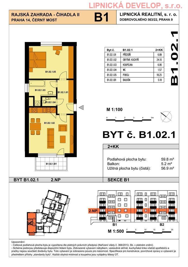 Prodej nového bytu s označení B1.02.1 o dispozici 2+kk v developerském projektu AREÁL RAJSKÁ ZAHRADA - ČIHADLA II, BYTOVÉ DOMY "B", "D", PRAHA 9. Byt se nachází v bytovém domě B. Podlahová plocha bytu je 59,8 m2 (užitná plocha bytu je 56,9 m2) + sklepní kóje o výměře 1,7 m2 + balkon o výměře 5,2 m2. Byt se nachází ve 2. nadzemním podlaží domu. Byt se skládá z obývacího pokoje, ložnice, chodby, koupelny a WC.