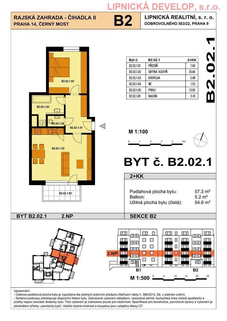 Prodej nového bytu s označení B2.02.1 o dispozici 2+kk v developerském projektu AREÁL RAJSKÁ ZAHRADA - ČIHADLA II, BYTOVÉ DOMY "B", "D", PRAHA 9. Byt se nachází v bytovém domě B. Podlahová plocha bytu je 57,3 m2 (užitná plocha bytu je 54,6 m2) + sklepní kóje o výměře 1,6 m2 + balkon o výměře 5,2 m2. Byt se nachází ve 2. nadzemním podlaží domu. Byt se skládá z obývacího pokoje, ložnice, chodby, koupelny a WC.