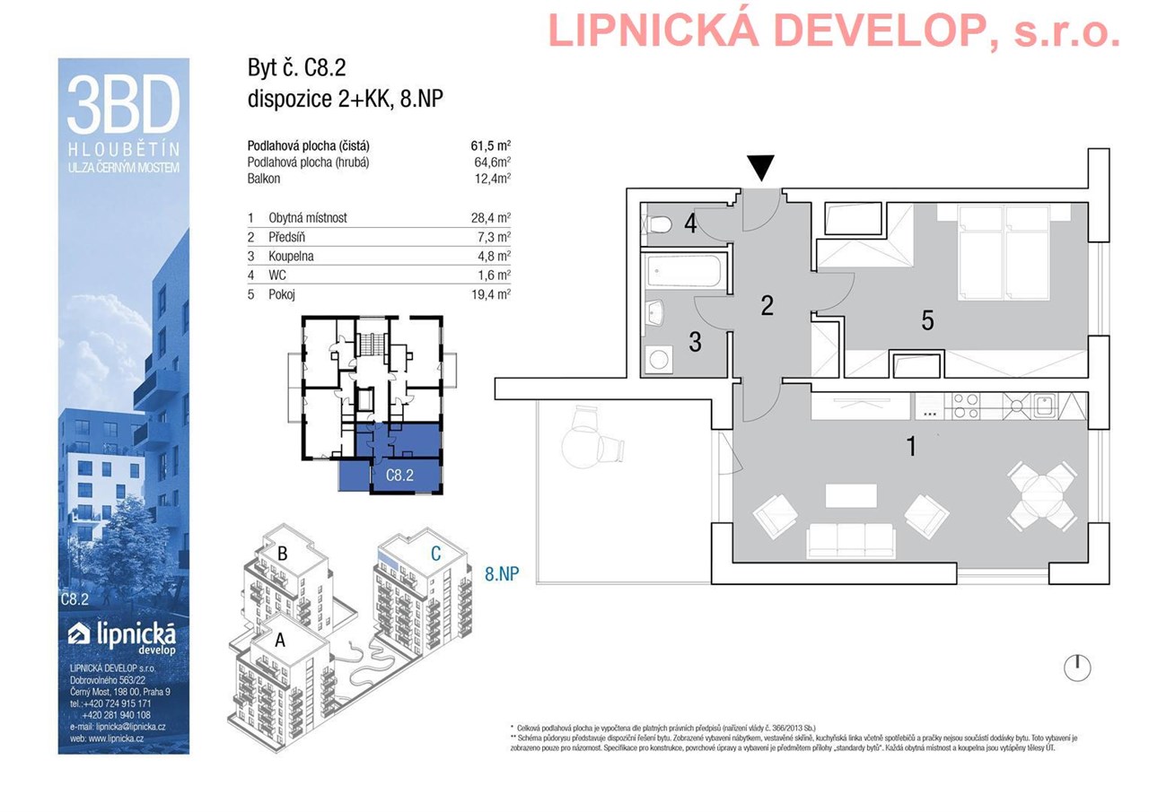 Prodej nového bytu s označením C8.2 o dispozici 2+kk v developerském projektu "NOVOSTAVBA 3 BYTOVÝCH DOMŮ", Hloubětín. Podlahová plocha bytu je 64,4 m2 (užitná plocha bytu je 61,8 m2) + sklep o výměře 4,2 m2 + balkón o výměře 12,4 m2. Byt se nachází v 8. nadzemním podlaží domu. Byt se skládá z obývacího pokoje s kuchyňským koutem, ložnice, koupelny, WC a předsíně. Z obývacího pokoje je vstup na balkón. K bytu je třeba dokoupit uzavřené parkovací stání v ceně 400.000,- Kč vč. DPH, které není v ceně bytu. Parkovací stání je umístěné v 1. podzemním podlaží domu.