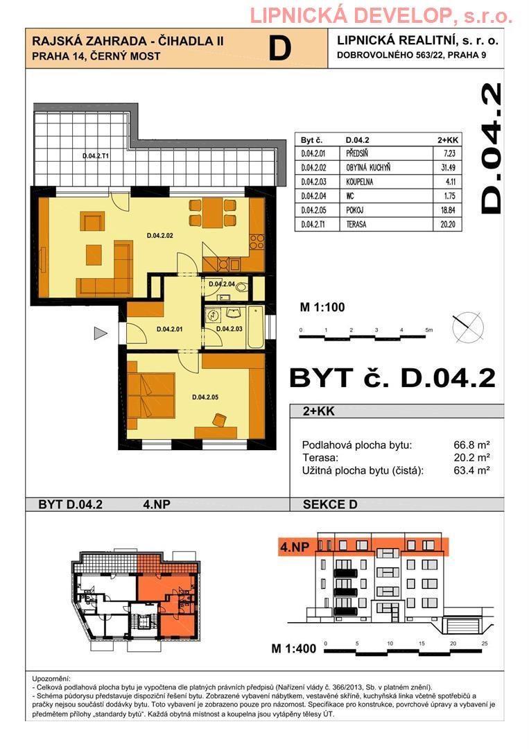 Prodej nového bytu s označení D.04.2 o dispozici 2+kk v developerském projektu AREÁL RAJSKÁ ZAHRADA - ČIHADLA II, BYTOVÉ DOMY "B", "D", PRAHA 9. Byt se nachází v bytovém domě D. Podlahová plocha bytu je 66,8 m2 (užitná plocha bytu je 63,4 m2) + sklepní kóje o výměře 1,9 m2 + terasa o výměře 20,2 m2. Byt se nachází ve 4. nadzemním podlaží domu. Byt se skládá z obývacího pokoje, ložnice, chodby, koupelny a WC.